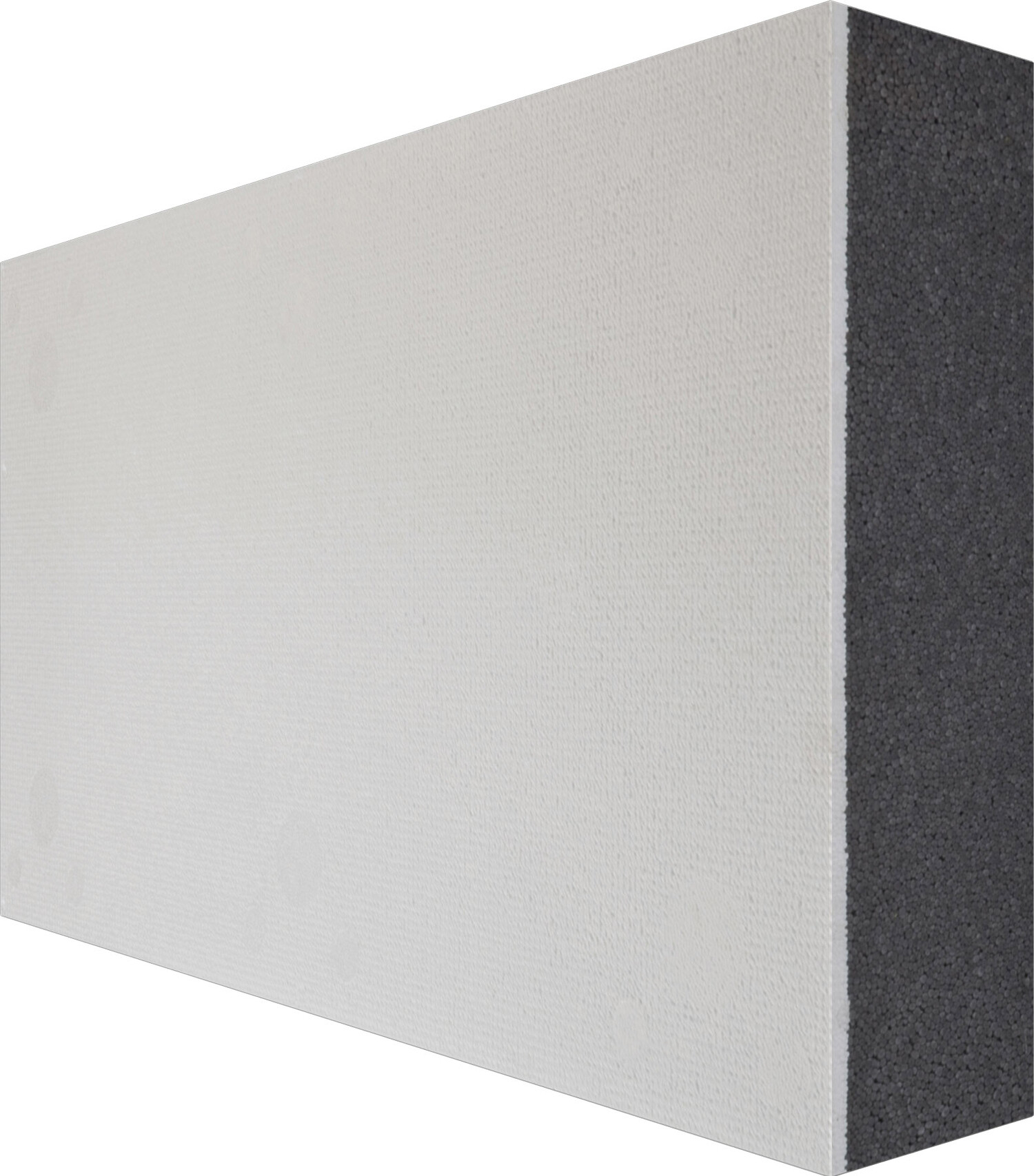 Graue, formstabile und schwundfreie Styropor-Fassadendämmplatte (WAP) mit stumpfer Kantenausbildung. Mit weisser Deckschicht und bauaufsichtlicher Zulassung im Baumit WDVS-System zum Verkleben an Wänden und Decken. Wärmeleitfähigkeit 0,032 W/(mK).