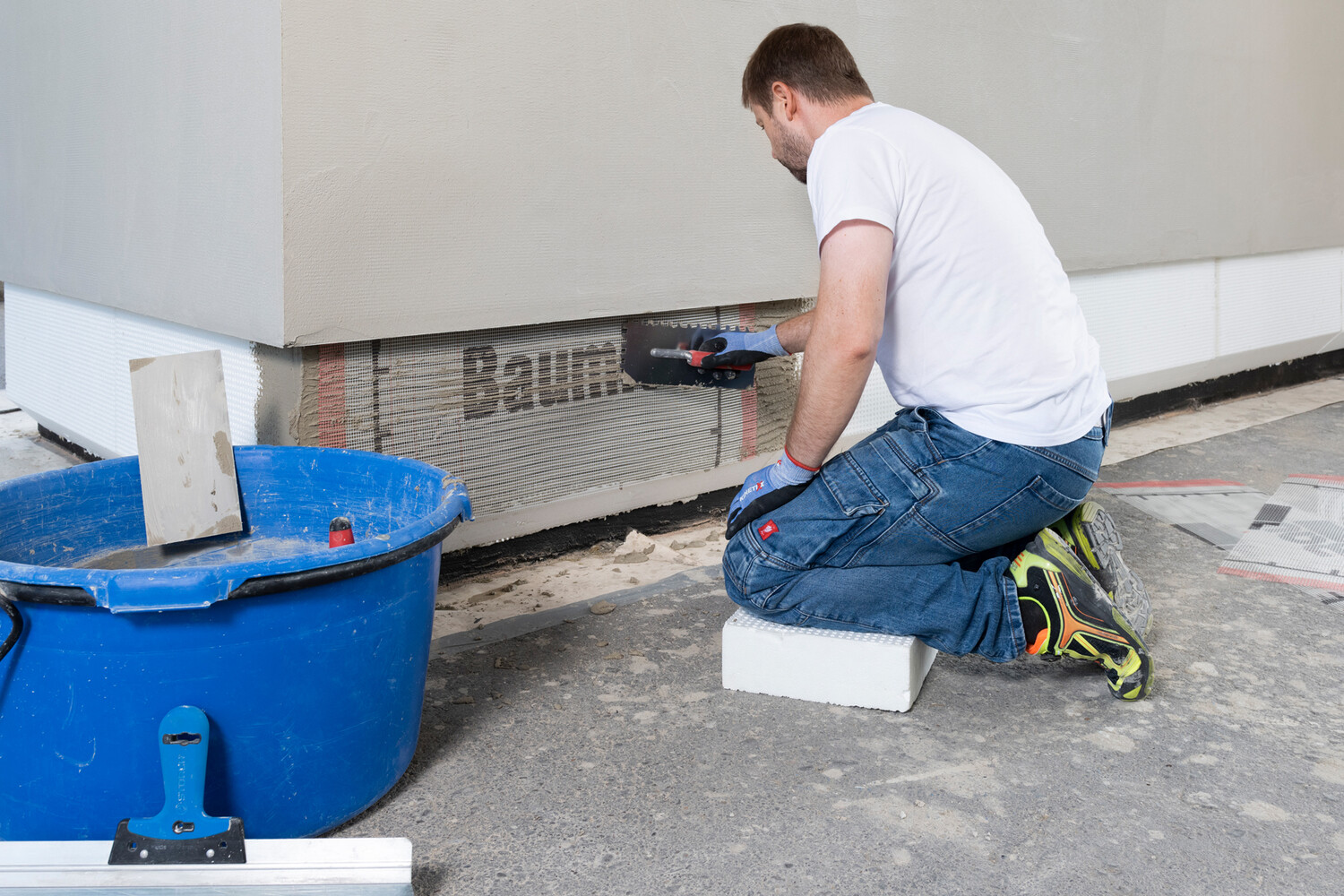 Faserverstärkter Klebemörtel und Armierungsmörtel für Baumit Sockeldämmplatten (EPS) und XPS-R Dämmplatten, speziell zum Kleben auch auf Bitumenanstrichen und Bitumendickbeschichtungen bei der Fassadendämmung.