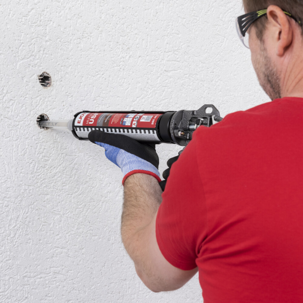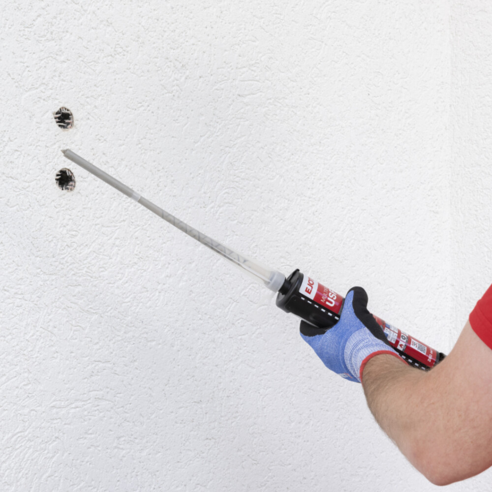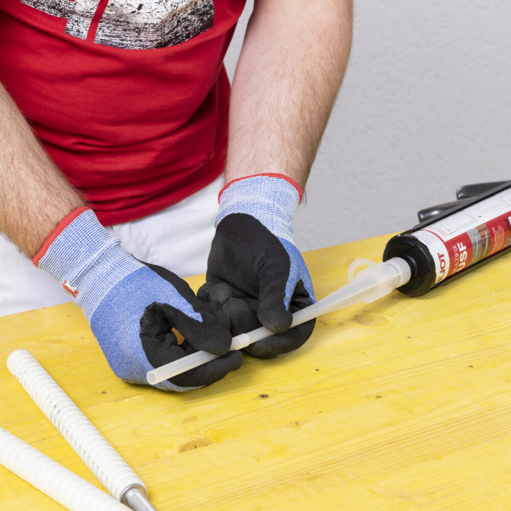 Nach dem Eindrücken in die Mischdüse hast du ca. 10 Minuten Zeit für die Verarbeitung. Daher solltest du möglichst alle zu füllenden Bohrlöcher vorbereiten und anschliessend alle Bohrlöcher nacheinander ohne Verzögerung füllen.