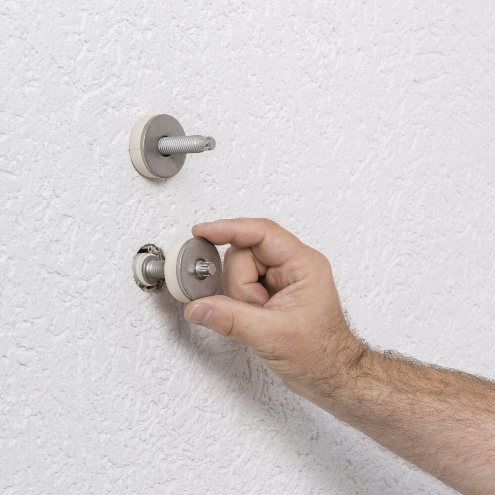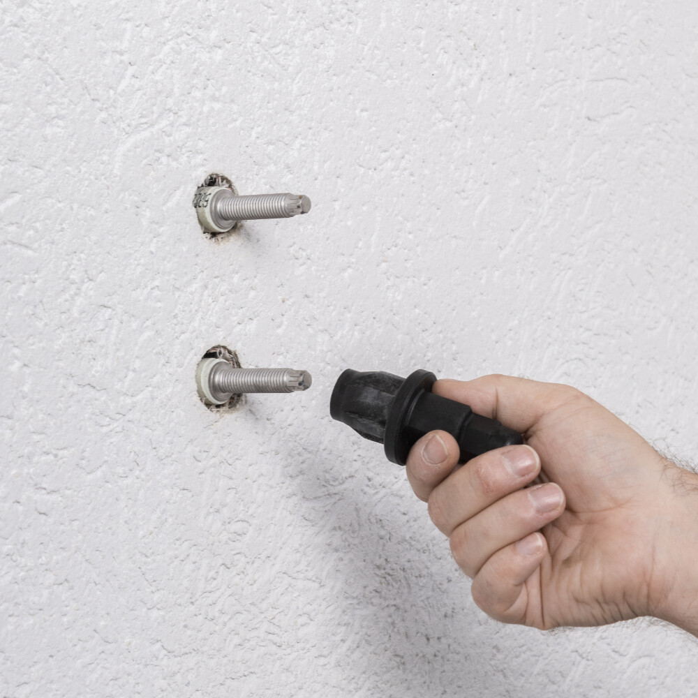 Mit Hilfe eines Maulschlüssels schraubst du das Befestigungsset so weit ein, bis der Fixierkonus oberflächenbündig auf der Dämmfassade aufliegt. Dabei weitet der Fixierkonus das Loch im Bereich des Dämmstoffes und fixiert gleichzeitig das Befestigungsset mittig im Bohrloch während der Mörtelkleber erhärtet.