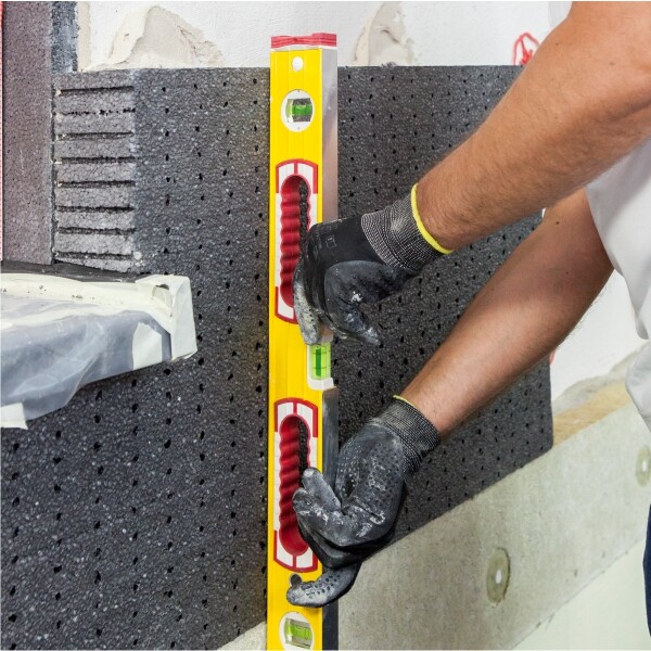 Kontrolliere die richtige Position der Dämmplatte mit einer Wasserwaage und korrigiere sie im Bedarfsfall.