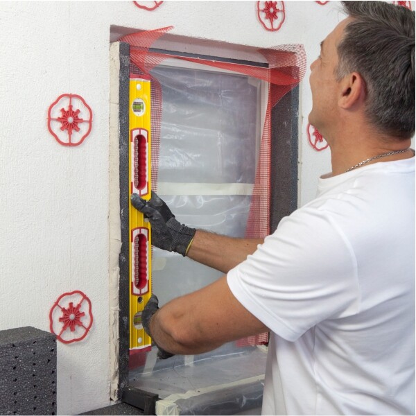 Kontrolliere die richtige Positionierung der Laibungsplatte mit einer Wasserwaage und korrigiere sie im Bedarfsfall.
