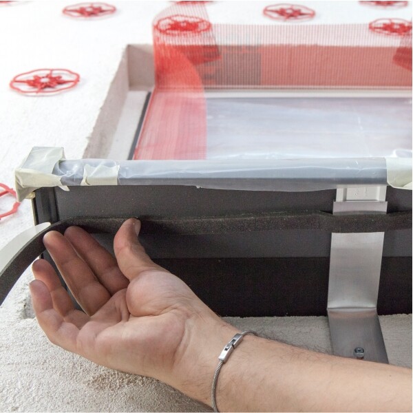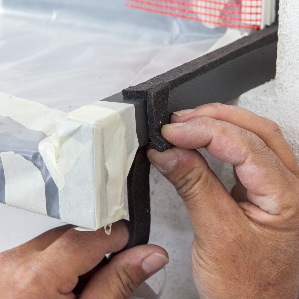 Den seitlichen Abschluss sowie die Abdichtung unter der Fensterbank kannst du entweder mit zwei Einzelstücken Fugendichtband ausführen oder auch aus einem Stück ankleben. Dabei ist es jedoch sehr wichtig, dass du beim Umlegen von der Seitenfläche auf die Unterseite eine ausreichend grosse Schlaufe mit dem Fugendichtband bilden.
