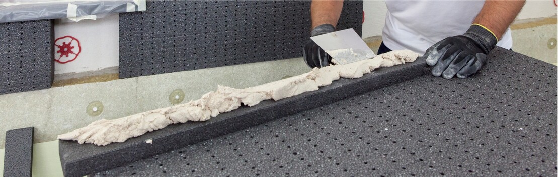 Schneide anschliessend die Laibungsplatte auf das benötigte Mass zu. Trage anschliessend vollflächig Opencontact W auf.