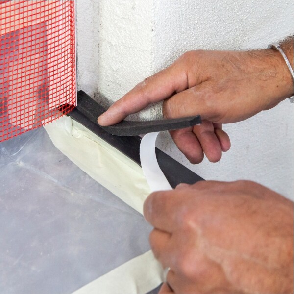 Beginne mit dem Ankleben des Fugendichtbandes auf dem Fensterbank-Endstück. Dabei ist das Fugendichtband richtig platziert, wenn es oberflächenbündig mit der nachfolgenden Laibungsplatte abschliesst.