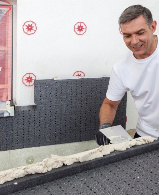 Die Arbeiten dürfen nur bei Temperaturen über 5 °C (Umgebungs- und Bauteiltemperatur) und möglichst nicht über 30 °C ausgeführt werden. Klebespachtel ist ein Zementprodukt und damit alkalisch. Schützen Sie sich mit entsprechender Arbeitskleidung (Handschuhe, Brille, etc.). Achten sie auf Ihre eigene Sicherheit beim Arbeiten an der Fassade. Verwenden Sie geeignete Steighilfen wie Leitern oder Arbeitsgerüste.