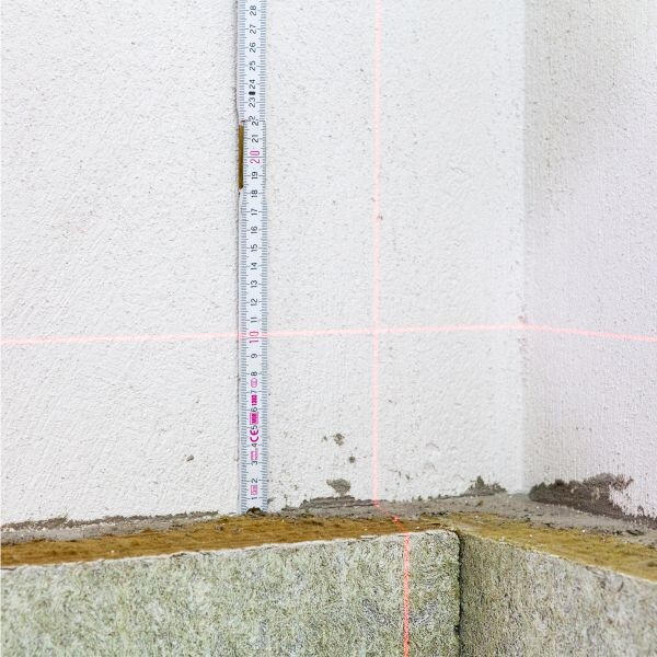 Um das Raster lot- und fluchtgerecht auf den fertigen Untergrund übertragen zu können, möchten wir dir zwei Varianten empfehlen. Zum einen kann man mit einem kleinen Laser (z. B. STABILA LAX 300) sehr schnell und einfach die Markierungen für die späteren Bohrlöcher auf der Fassade abtragen.