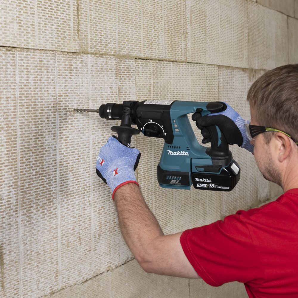 Mit dem 18 Volt Akku-Pack kannst du den Kombihammer zum Bohren, Hammerbohren und Meisseln sehr gut einsetzen. Die Einzelschlagstärke erreicht bis zu 2,0 Joule, in Beton beträgt die Bohrleistung bis zu 24 mm.