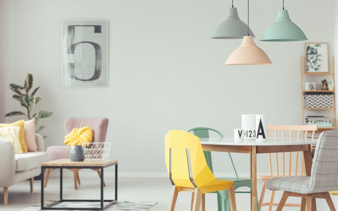 Avec des couleurs pastel claires et douces, tu peux faire en sorte qu'une petite pièce paraisse visuellement plus grande. Des couleurs riches et vives peuvent souligner ton mur et mettre en valeur les objets d'ameublement.