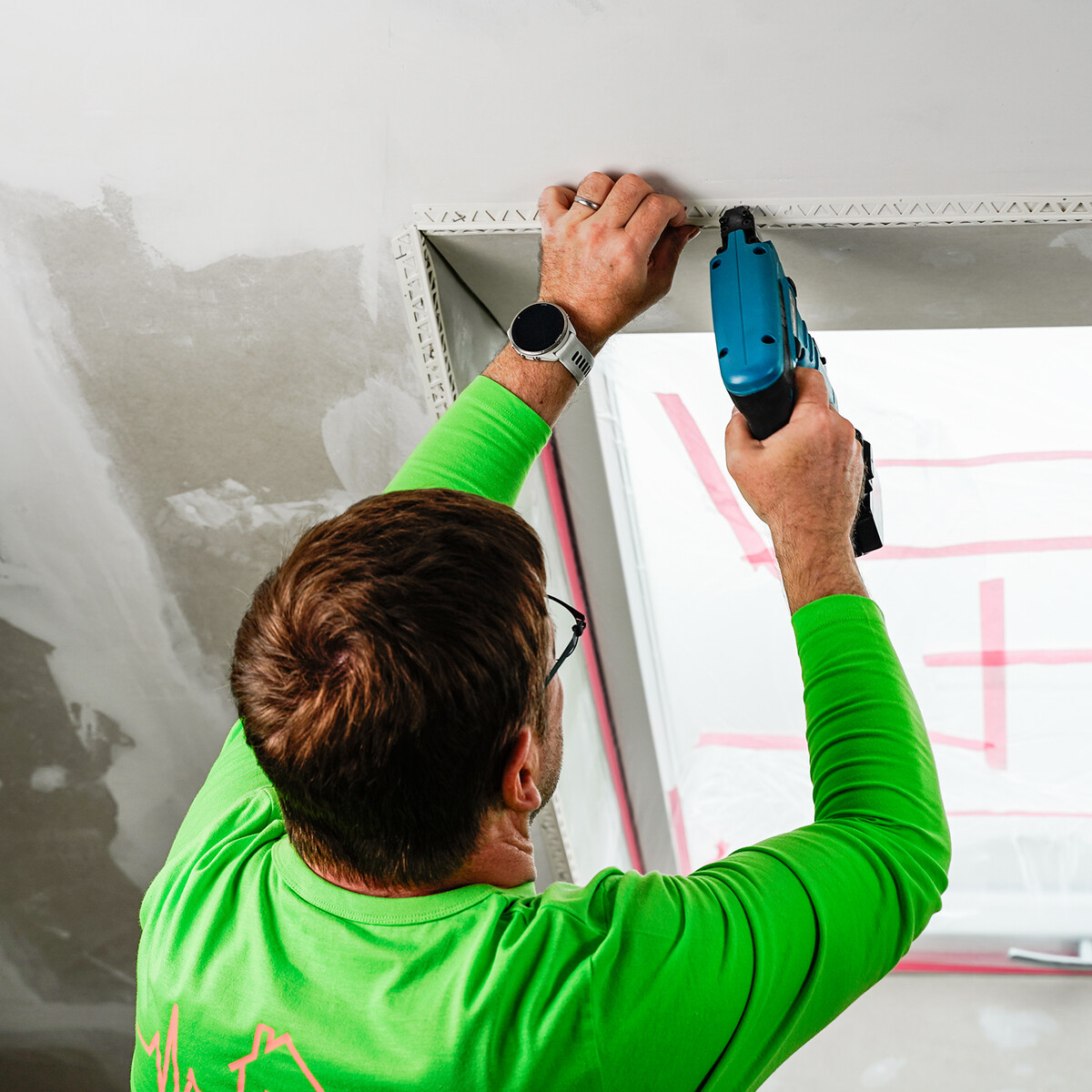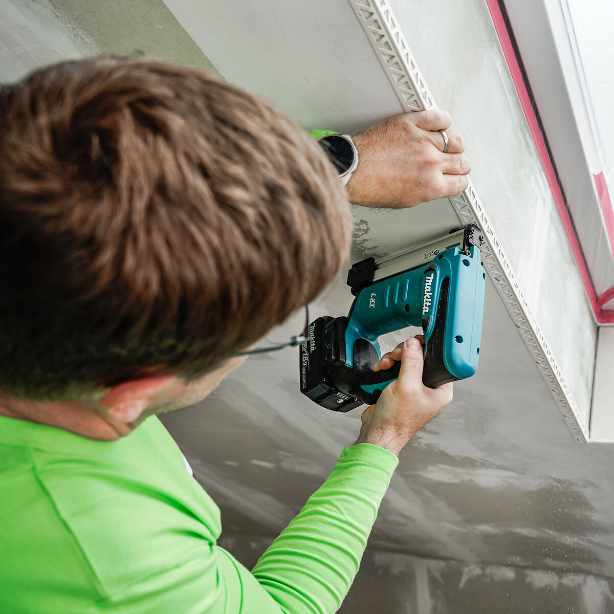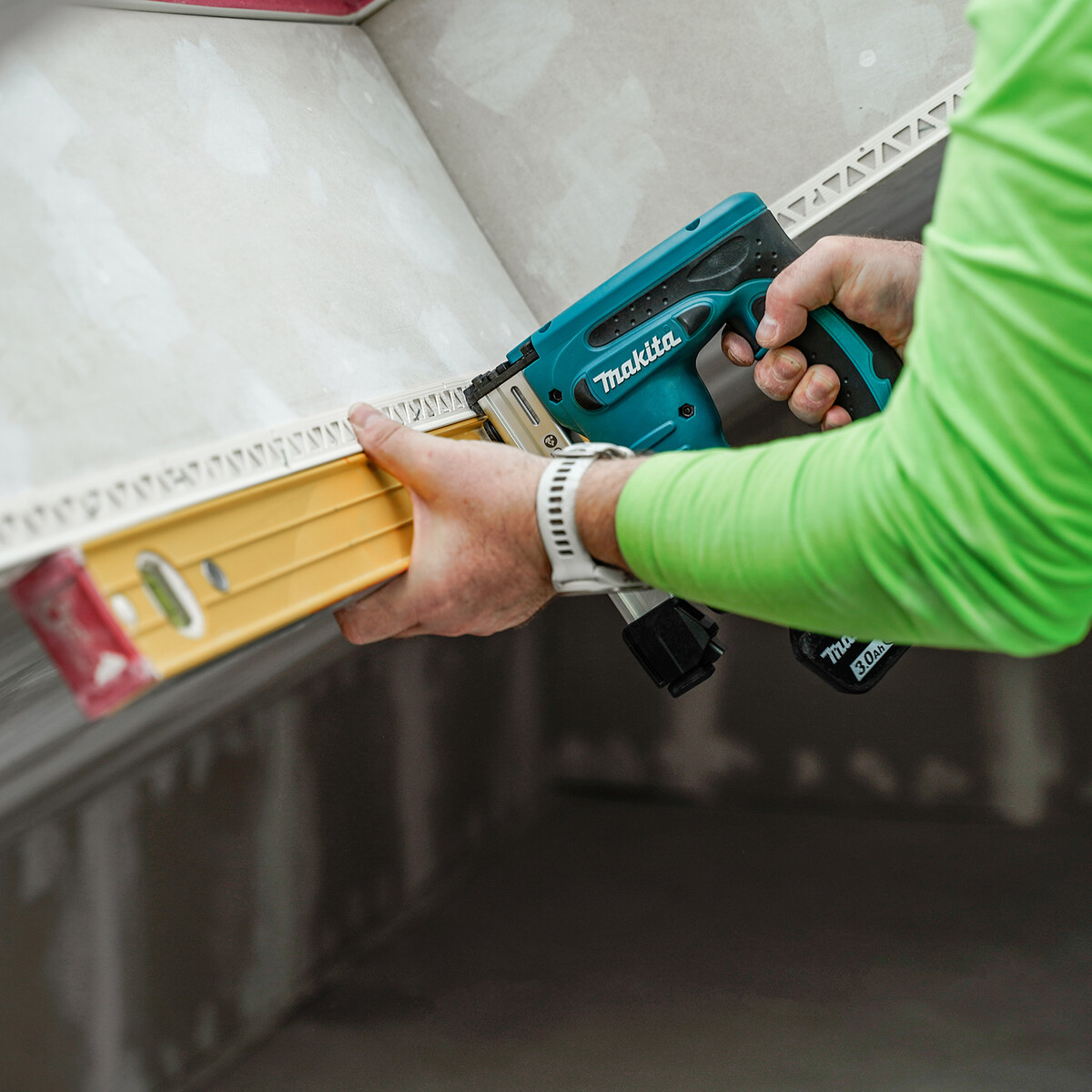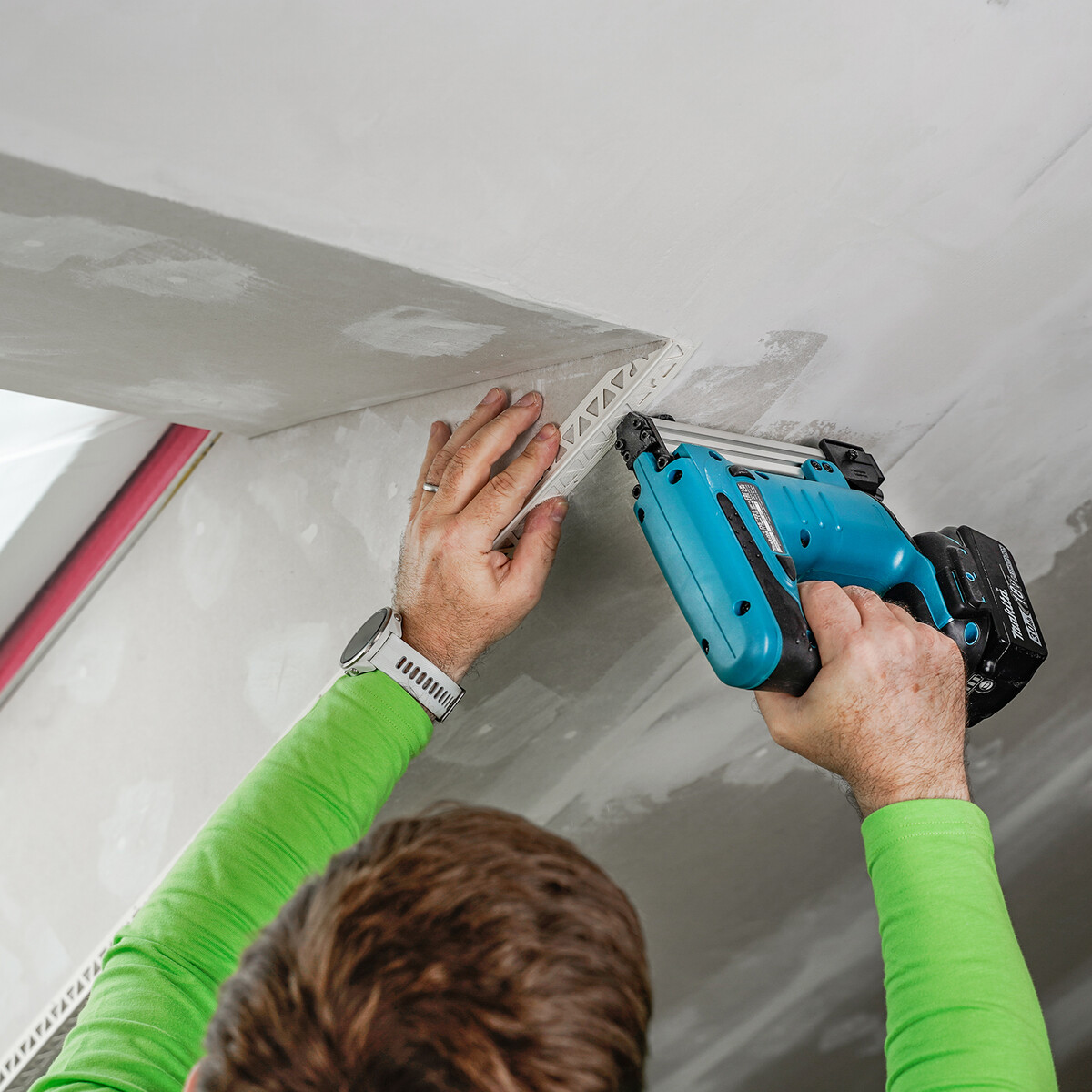 Lorsque tout est en place, tu commences par agrafer le premier côté du profilé à la plaque de construction sèche. Veille à ce que le profilé soit bien à fleur et droit.