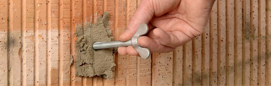 Ensuite, enfoncer l'élément à fixer (ancrage, chevilles, etc.) dans le mortier frais et l'aligner. Comme le Ciment à prise rapide Baumit durcit au bout de 3 à 5 minutes seulement, les étapes de travail doivent être effectuées rapidement les unes après les autres.