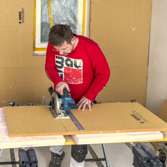 Pour garantir un montage sans joints du panneau d'embrasure, il est essentiel de réaliser des coupes droites et précises. Nous te recommandons donc d'utiliser un rail de guidage pour ta scie circulaire, en particulier pour les coupes plus longues.