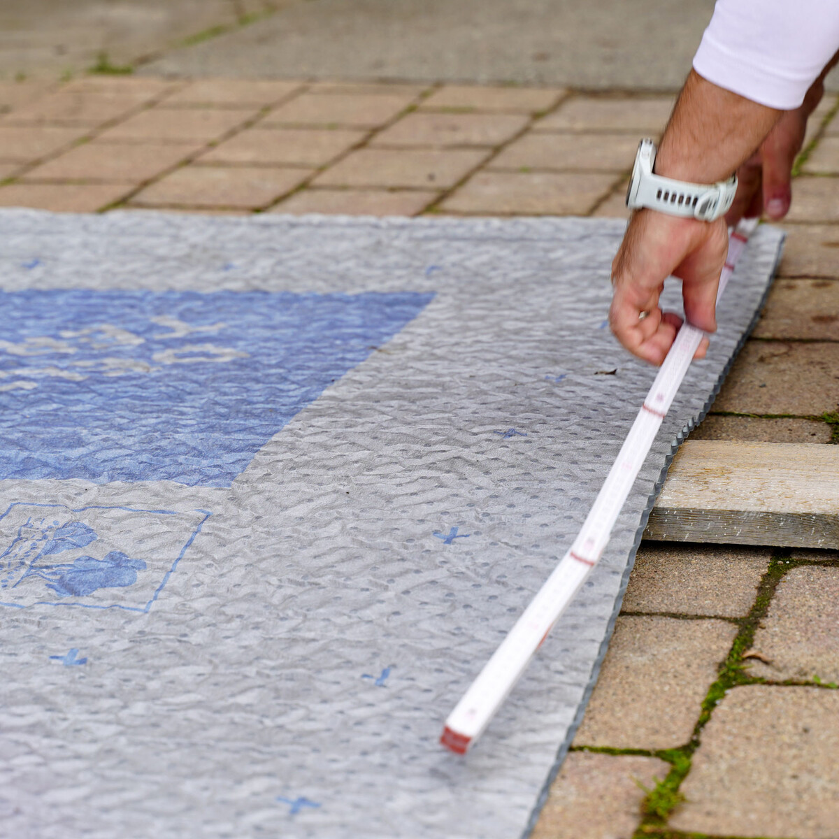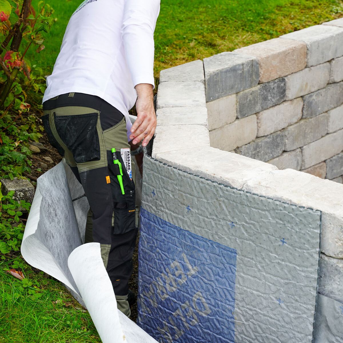 La nappe à excroissances Dörken DELTA-TERRAXX utilisée ici est équipée d'une bande adhésive permettant de relier facilement et sûrement les différentes nappes au niveau des zones de jonction.