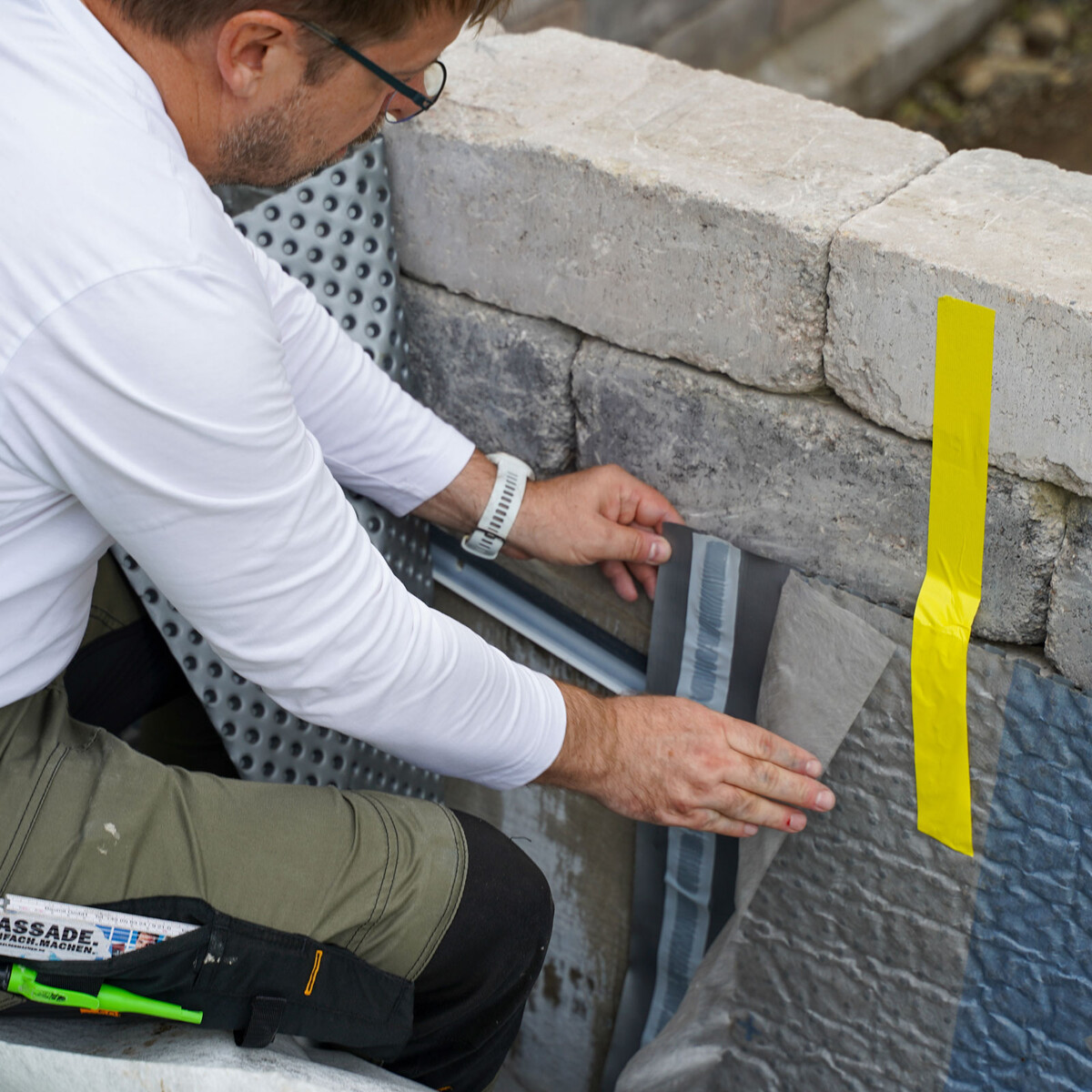 En raison de la diversité des conditions de chantier, les étapes de travail que nous avons présentées ne peuvent pas prendre en compte tous les cas particuliers. Elles montrent l'état actuel de nos expériences au moment de la réalisation des images et sont donc sans engagement. Respecte impérativement les consignes du fabricant de la membrane à excroissances ou de la membrane de drainage utilisée et du profilé.