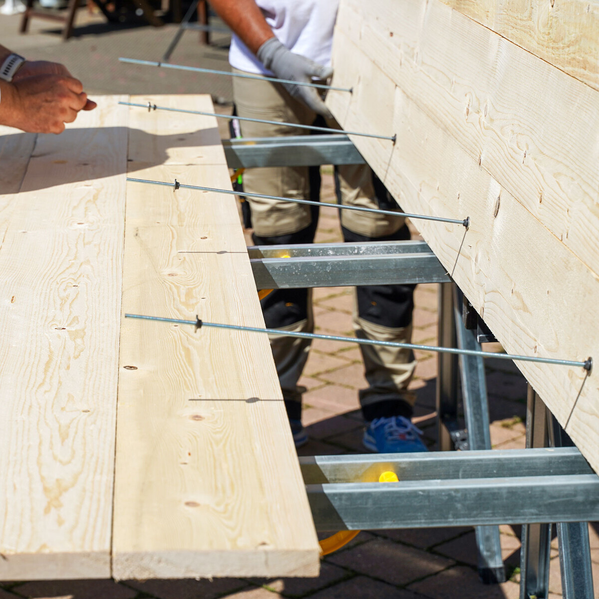 Introduis des tiges filetées de 6 mm dans les trous préparés afin de relier les panneaux de coffrage de manière stable dans la partie inférieure.