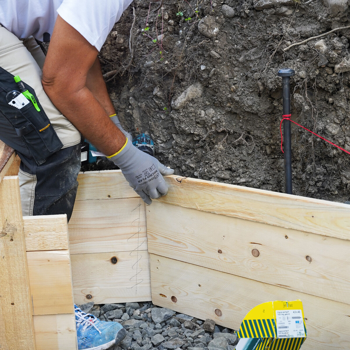 Pour faciliter la manipulation, nous scions les planches de coffrage à une longueur maximale de 2,5 mètres.