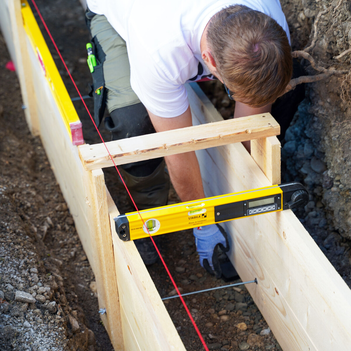 Une fois que tous les éléments de coffrage sont en place et vissés les uns aux autres, le coffrage est mis à l'horizontale. Pour cela, tu as besoin d'un long niveau à bulle (1,7 à 2 m) ainsi que d'un niveau à bulle plus court pour l'alignement vertical.