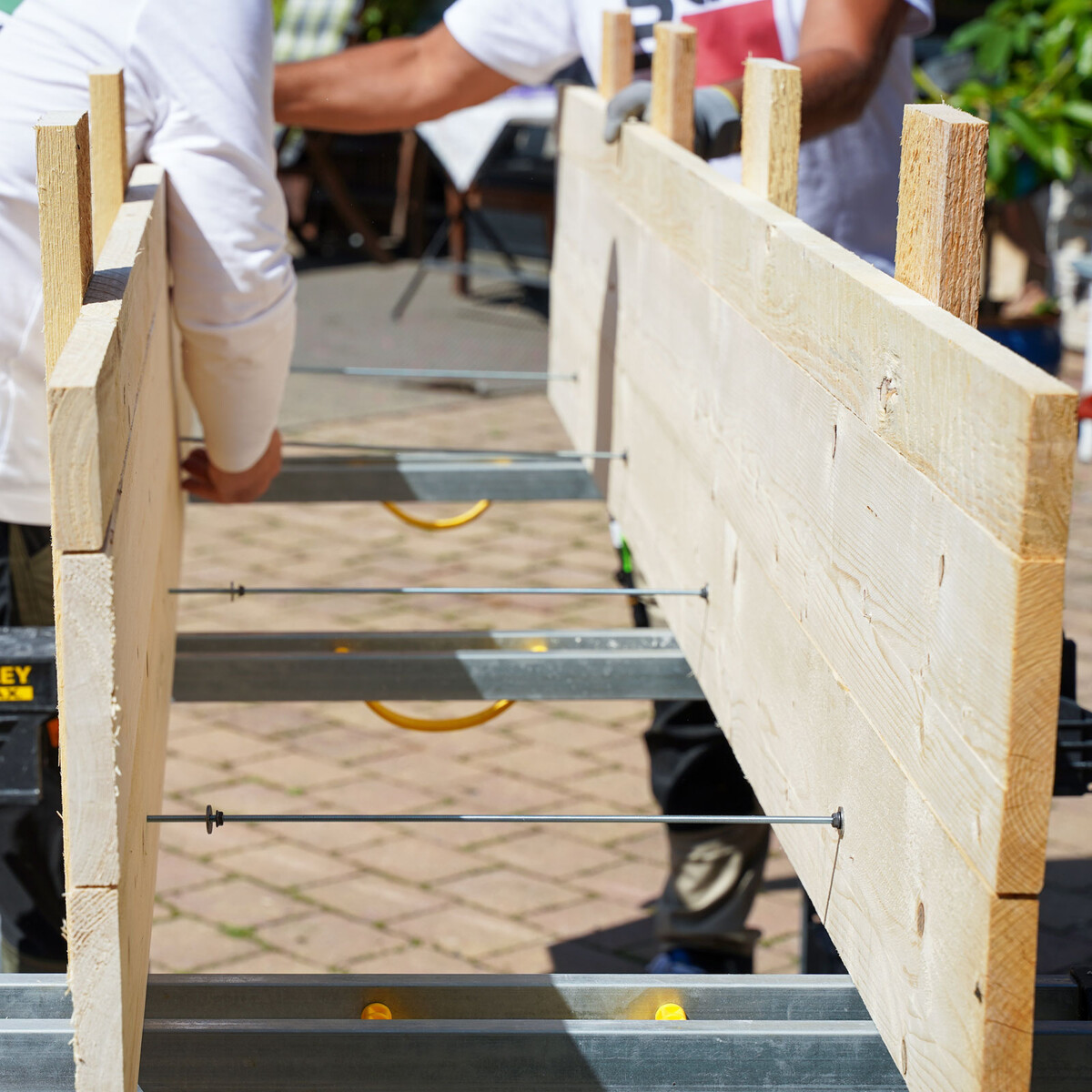 Ensuite, nous plaçons les éléments de coffrage latéraux. Tu peux maintenant utiliser un rapporteur pour aligner exactement le coffrage et mesurer avec précision les longueurs nécessaires.
