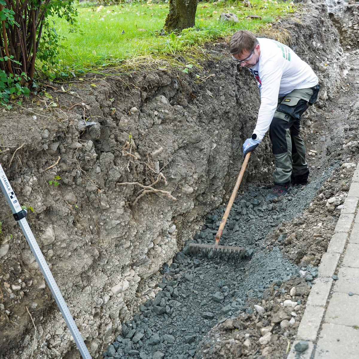 Compactez donc soigneusement le sol afin d'éviter les tassements et veillez à ce que le gravier antigel soit réparti uniformément et également compacté. Tu éviteras ainsi les dégâts dus au gel et garantiras des fondations solides.