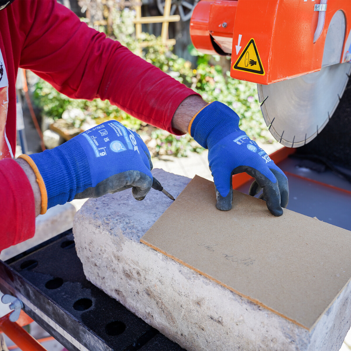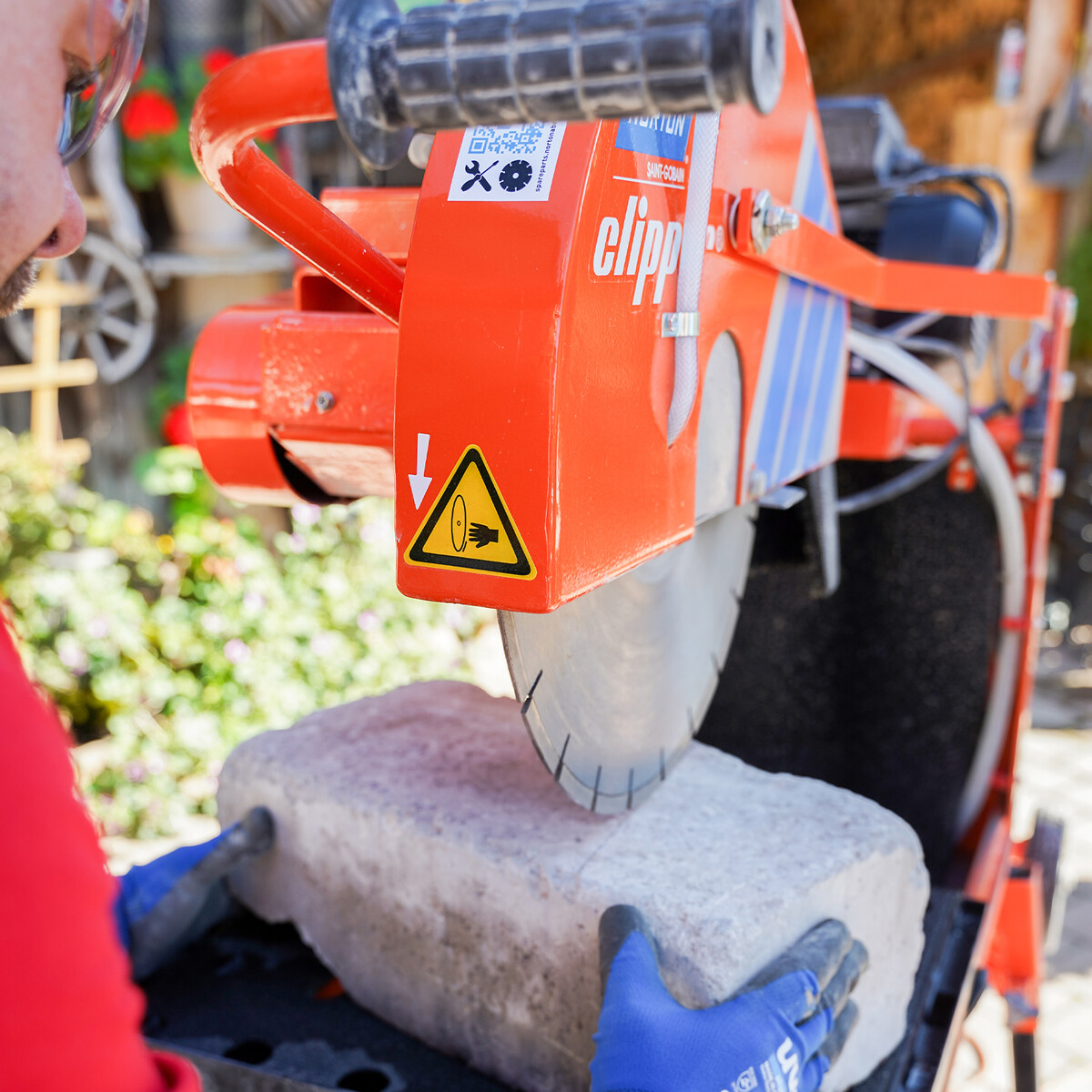 Veille à ta propre sécurité et à ta santé. Lorsque tu travailles avec une scie à pierre, porte des vêtements de travail appropriés, des gants de travail, des lunettes de protection et des protections auditives adaptées à ce type de travail. En règle générale, on utilise pour cela des protections auditives de niveau 3.