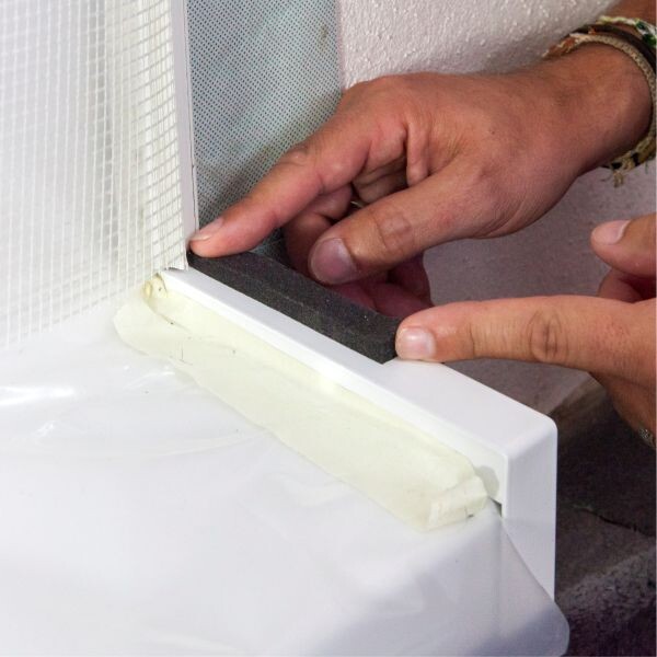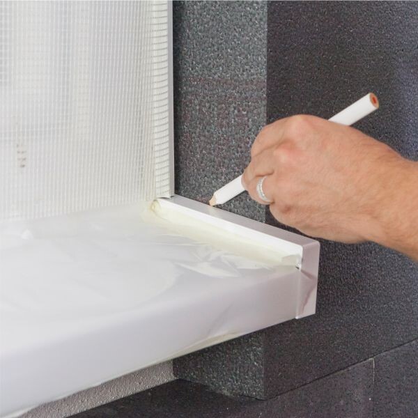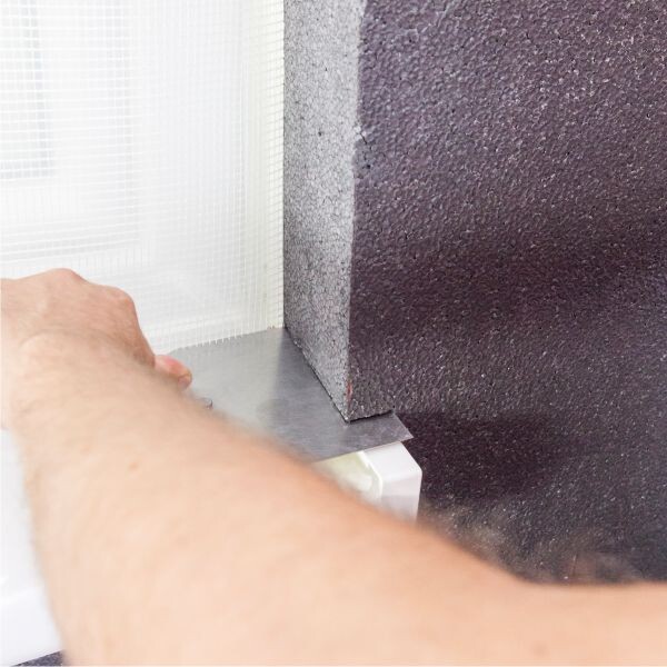 Pour assurer l'étanchéité entre l'extrémité de l'appui de fenêtre et le système d'isolation, une bande d'étanchéité de joint est collée avant le collage du panneau isolant. Veille à n'utiliser que des bandes d'étanchéité de joint autorisées par la surveillance des chantiers, dont la largeur est d'au moins 15 mm et dont l'étanchéité à la pluie battante et au vent est garantie pour des largeurs de joint de 3 à 7 mm.