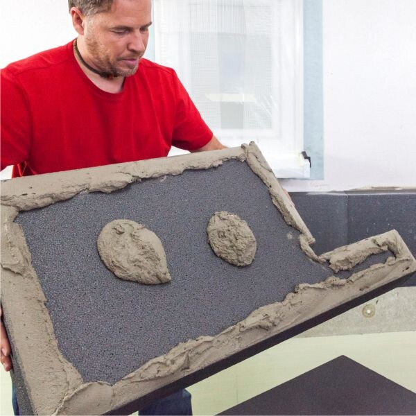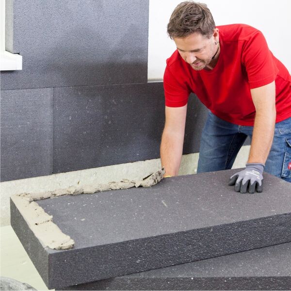 Ensuite, applique 3 couches de mortier de manière uniforme sur le Panneau isolant. Au total, tu dois obtenir une surface de collage d'au moins 40 % de la surface du panneau après l'avoir pressé contre le mur.