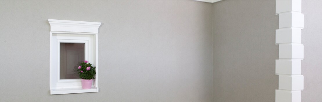 Une façade classique avec une structure d'enduit fine et des éléments en stuc, le tout dans un style moderne.