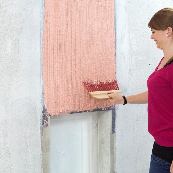 Tu peux maintenant donner la structure souhaitée à la couche d'enduit à l'aide d'un balai à structure à une rangée. Veille à travailler de manière régulière pour obtenir des résultats optimaux.