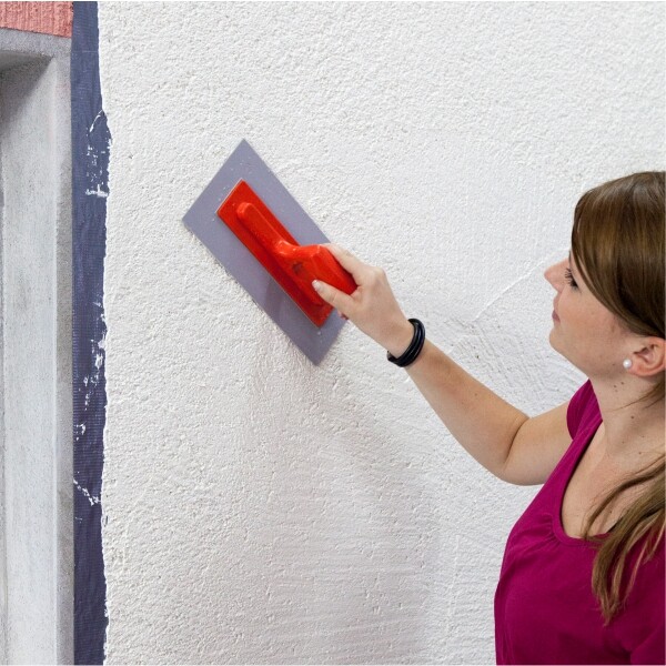 Mélange l'enduit avant de l'appliquer, puis applique-le à l'aide d'une truelle inoxydable (sur le Support préparé) en respectant l'épaisseur du grain. Pour les grandes surfaces continues, divise le mur/la façade en parties d'environ 1 à 1,5 m². Travaille de haut en bas afin d'éviter de "salir" la surface d'enduit finie par la chute de matériaux pendant l'application ou la structuration. Une surface continue doit être entièrement enduite sans pause afin d'éviter les raccords inesthétiques. Nous recommandons donc de faire appel à deux personnes pour réaliser une grande surface d'enduit.