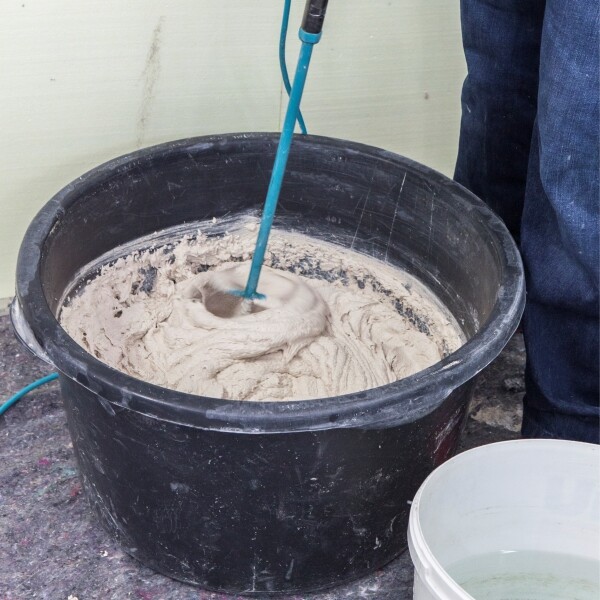 Mélange l'Edelweiss Structo dans un seau ou un bac à mortier propre avec de l'eau propre. Pour un sac entier d'Edelweiss Structo, tu as besoin de 6,5 à 7,5 litres d'eau. Adapte la quantité d'eau en conséquence si tu mélanges moins de Matériau. Un mélangeur électrique peut te faciliter la tâche.