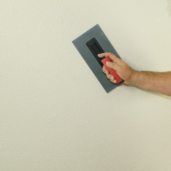 Applique l'Edelweiss Structo fraîchement mélangé sur le Support préparé et séché à l'aide d'une truelle en inox. Si tu souhaites ensuite frotter l'enduit à l'aide d'une taloche en plastique, l'enduit doit être appliqué à l'épaisseur du grain, soit environ 1 mm. N'applique pas plus de 1-1,5 m² environ avant de structurer la surface. Étant donné que l'enduit sèche rapidement en raison de sa faible épaisseur, il est sinon plutôt difficile de structurer sans problème les grandes surfaces. Si tu souhaites par contre feutrer l'enduit avec une planche de feutre, applique l'enduit uniformément sur une épaisseur d'environ 2-3 mm.