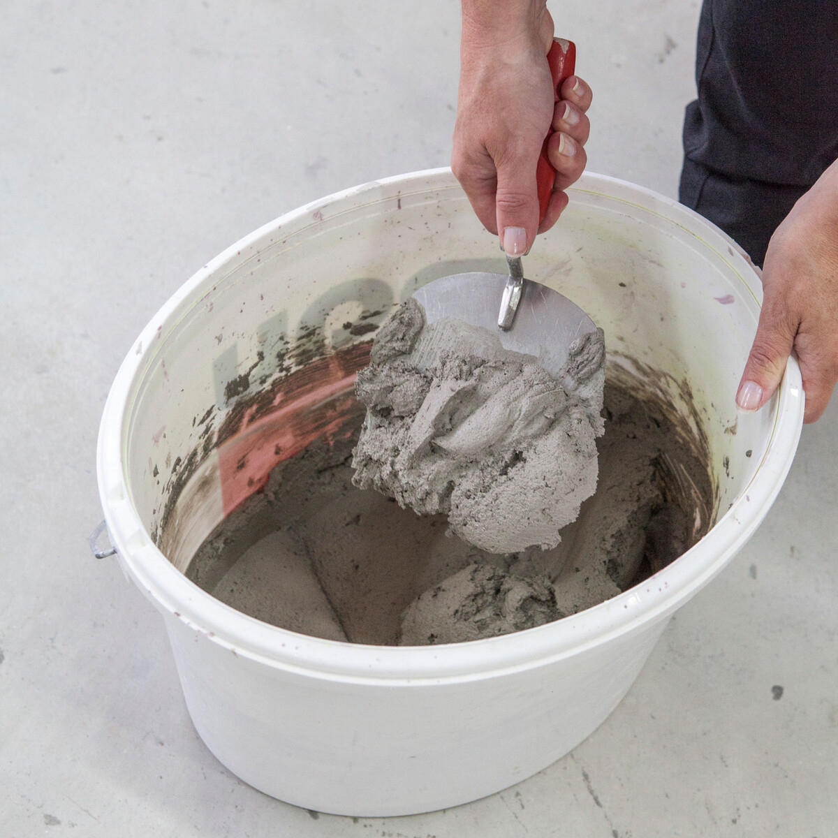 Ensuite, tu mélanges l'enduit ou le mortier d'enduit avec de l'eau dans un seau propre. Tu trouveras des informations sur les quantités d'eau nécessaires au dos du sac et dans la Fiche technique du produit.
