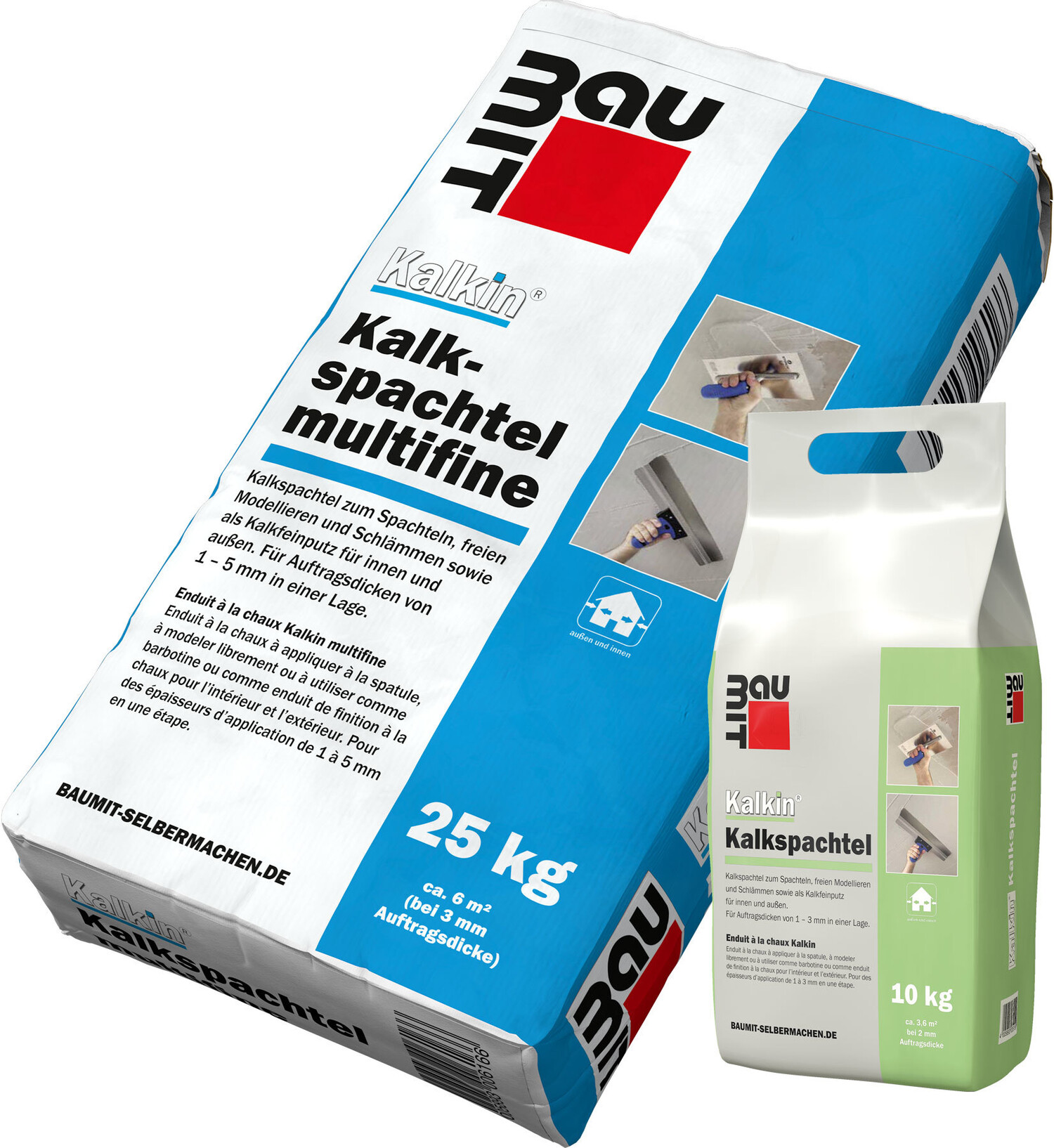 Enduit à la chaux blanc naturel comme enduit fin ou enduit feutré pour l'intérieur sur les murs et les plafonds dans toutes les pièces d'habitation, y compris les pièces humides. Il peut être utilisé à l'extérieur sur l'ensemble de la façade et du soubassement. Applicable de 1 à 5 mm.