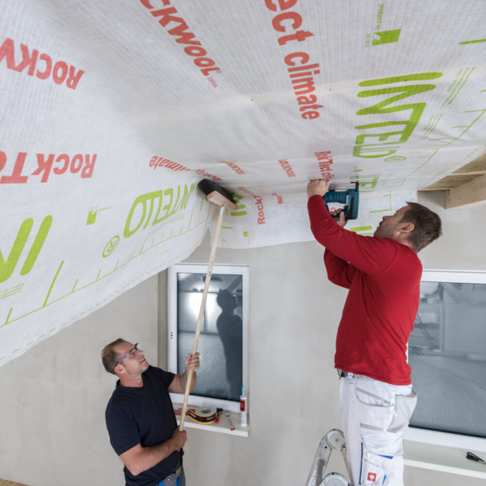 Après la pose complète du pare-vapeur, il faut éventuellement encore raccorder une fenêtre de toit au film pare-vapeur.