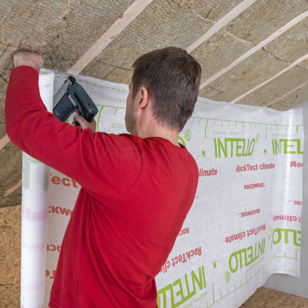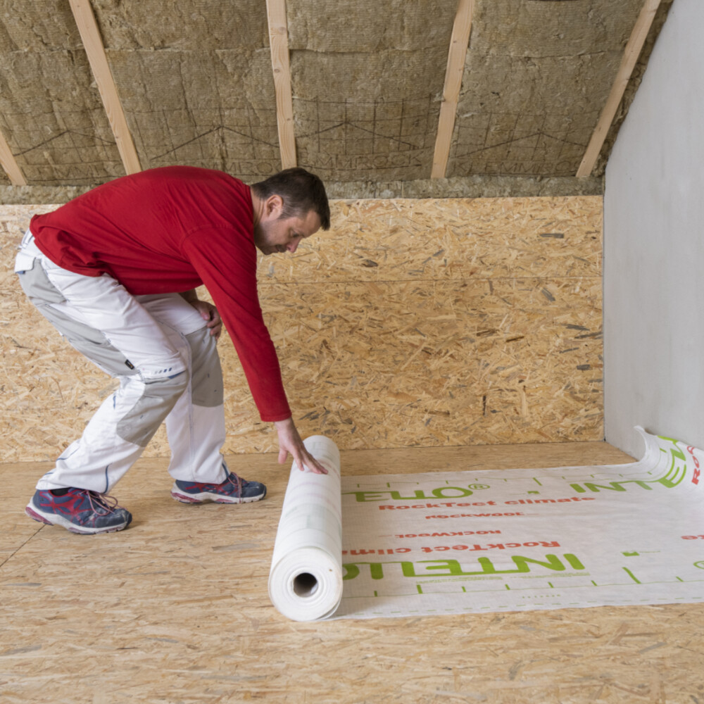 Lors de la détermination des points de fixation, veille à ce que le freine-vapeur soit collé sur le chevron / l'entrait de toit avec un chevauchement d'au moins 10 cm. En même temps, il faut un peu de tampon pour la transition entre la pente du toit et les combles afin de compenser les éventuels mouvements de la construction.