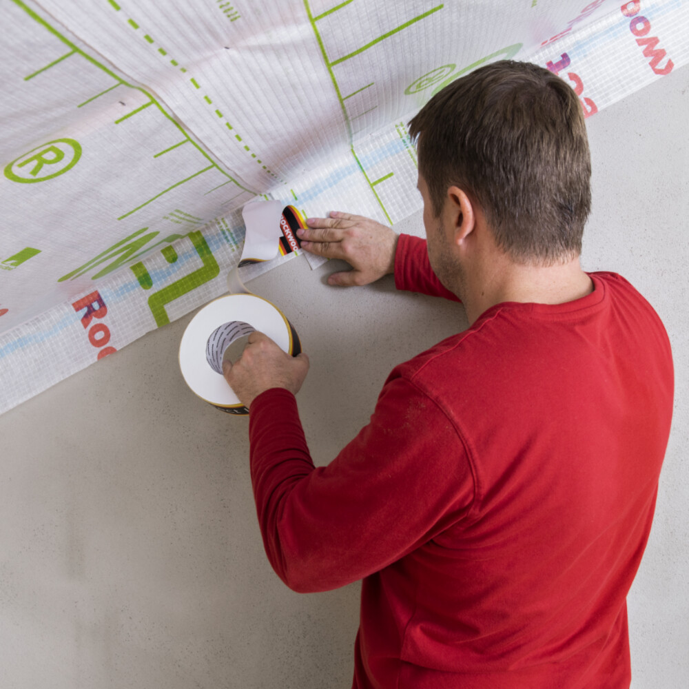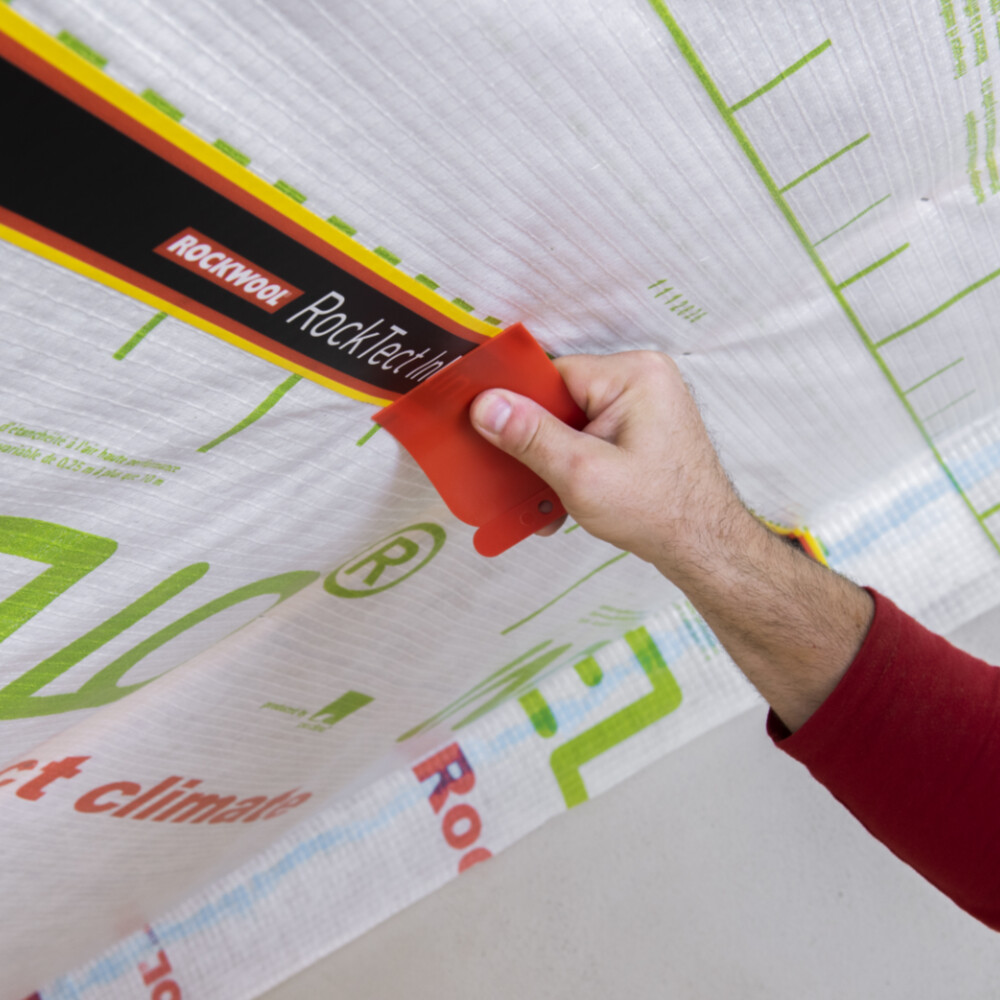 Enfin, tu presses fermement le ruban adhésif sur le pare-vapeur à l'aide d'un petit rouleau en caoutchouc. Les rouleaux en caoutchouc mousse ou les rouleaux de couture utilisés dans le domaine de la peinture ne sont pas adaptés à cet effet.