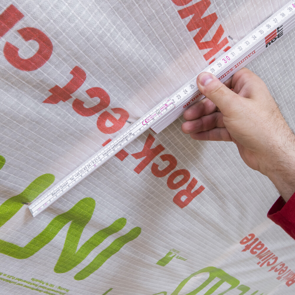 Après avoir mesuré le morceau nécessaire, tu découpes le pare-vapeur sur mesure. Le film se coupe facilement avec des ciseaux ou un cutter bien aiguisé.
