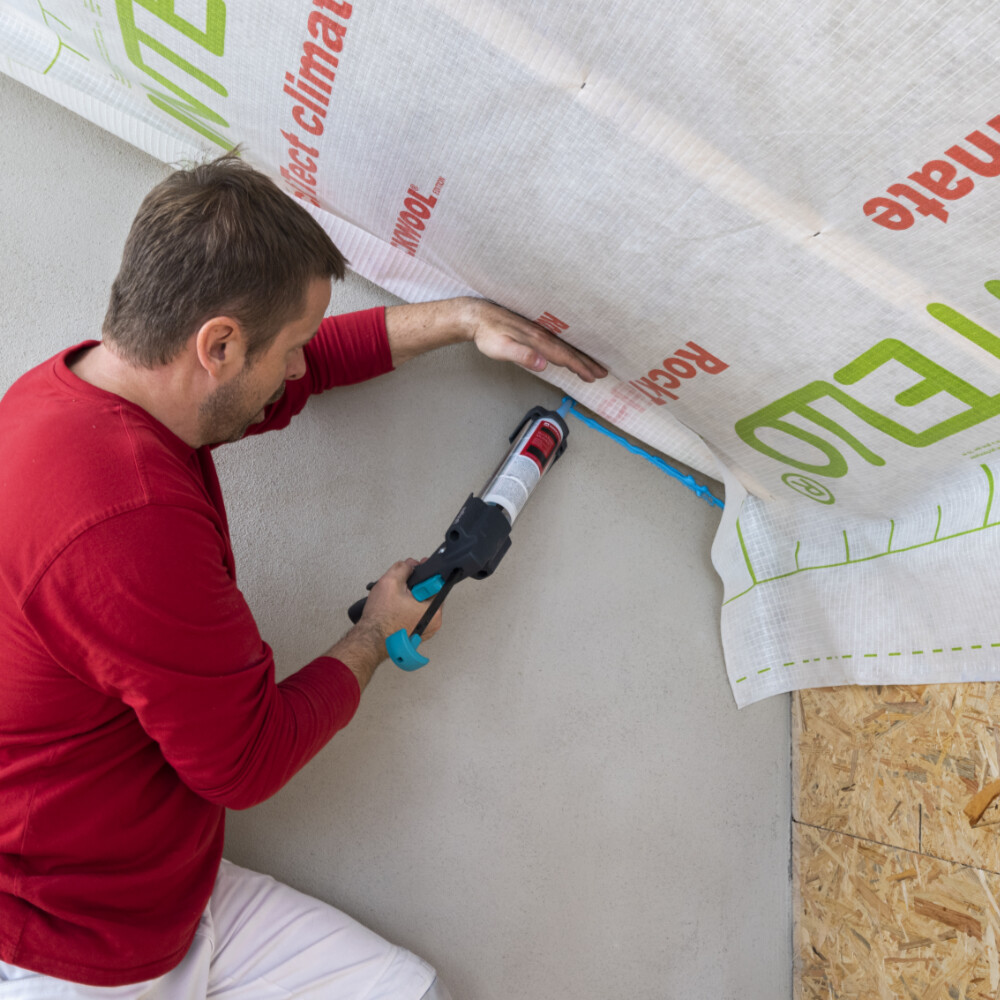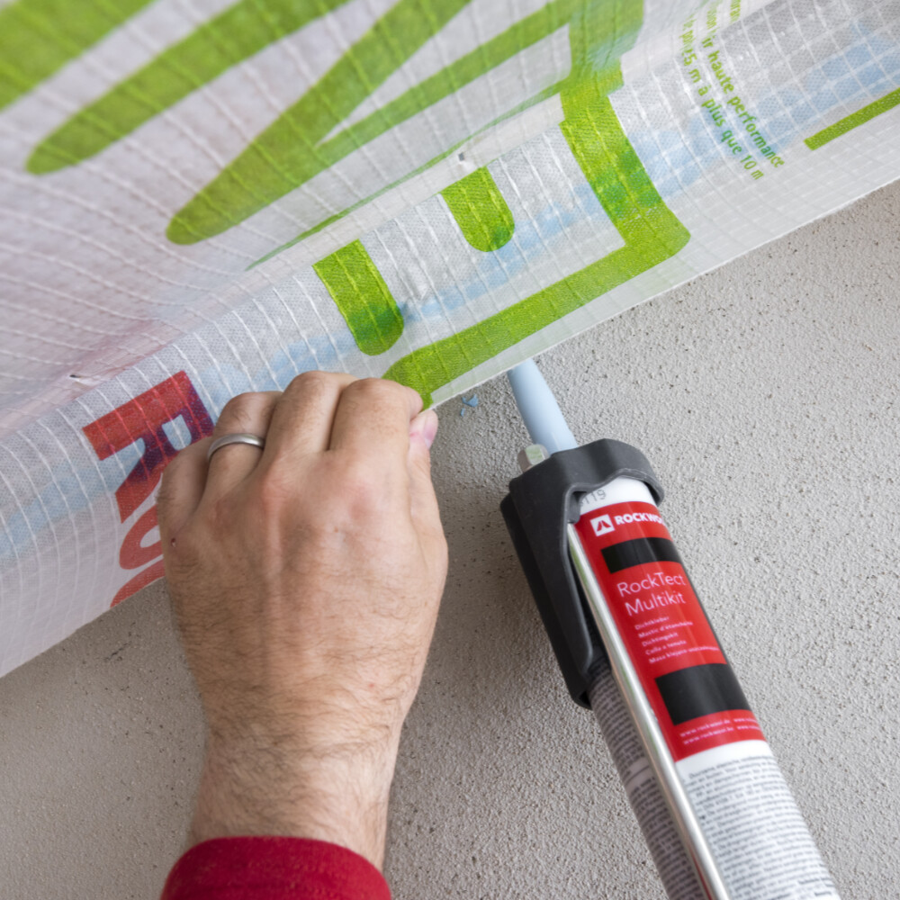 Pour le raccordement étanche à l'air aux murs, etc., tu utilises la colle de contact prescrite par le fabricant du pare-vapeur. Il s'agit en général de colle en cartouche.