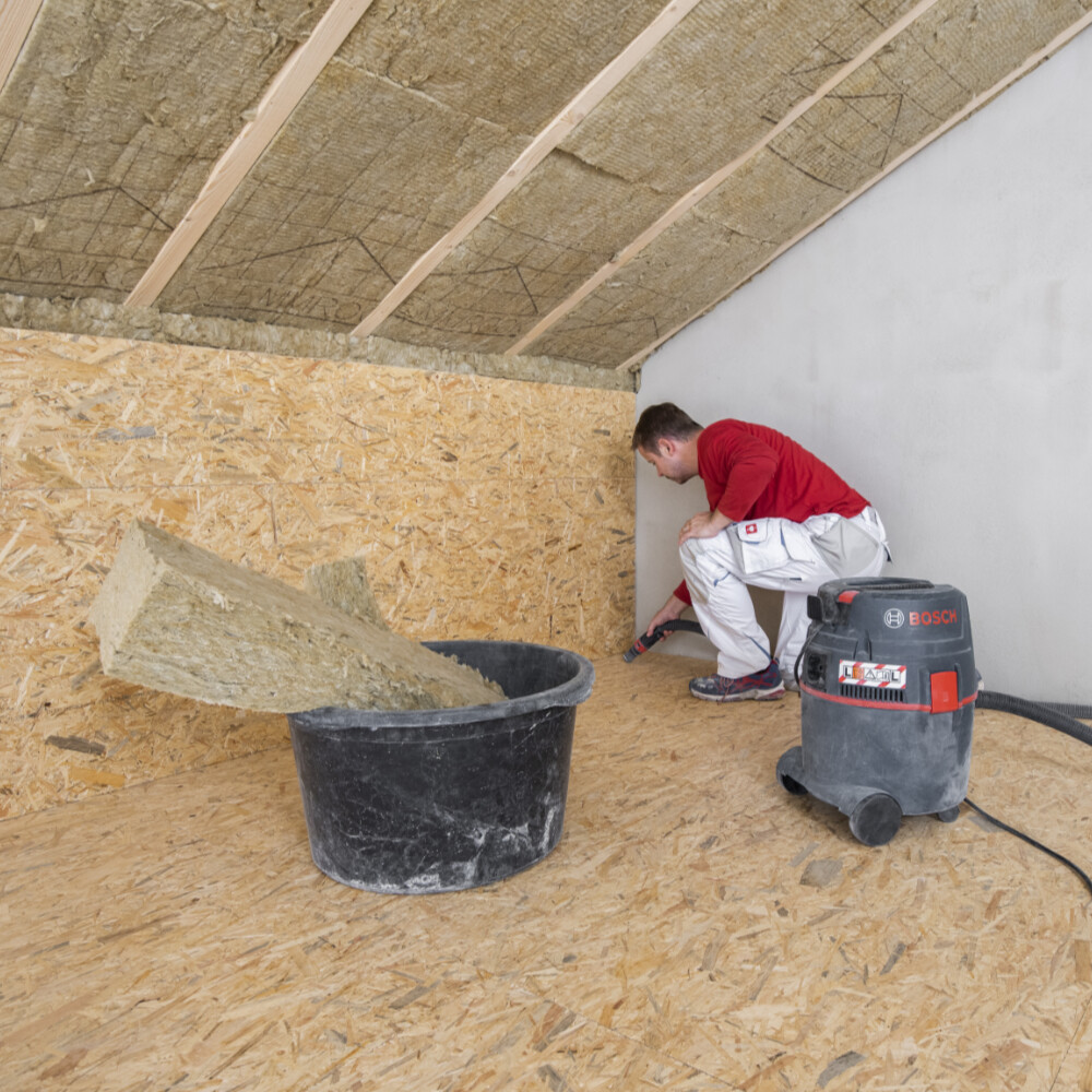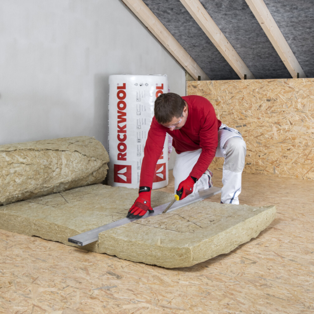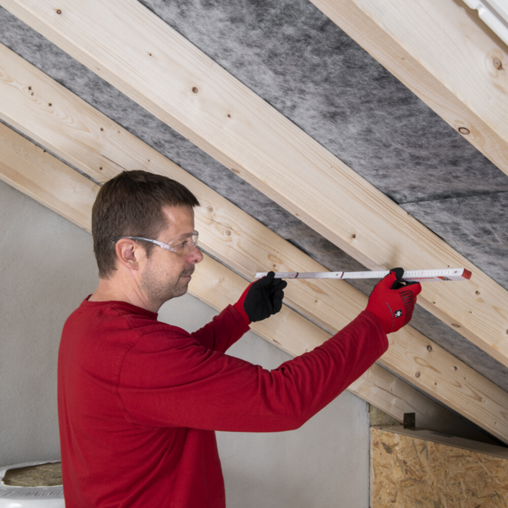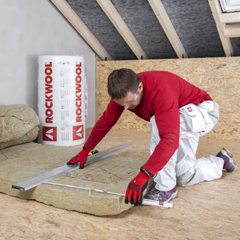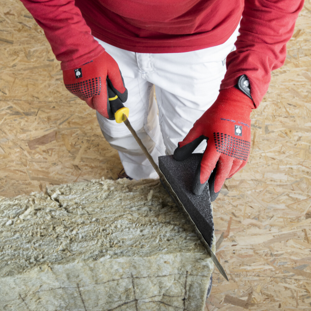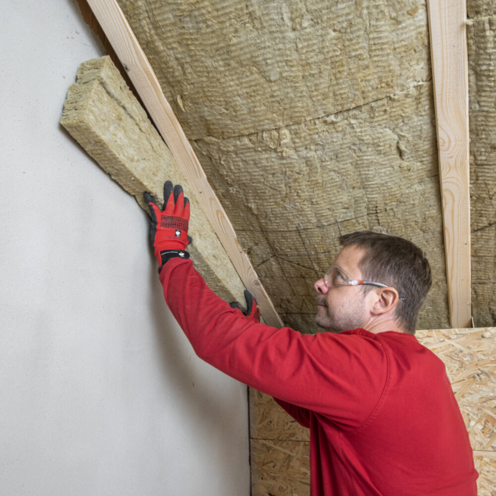 Lors de travaux d'isolation pour l'isolation de toitures avec de la laine de roche ou de la laine minérale, il est judicieux de porter des vêtements de travail à manches longues, des pantalons longs et d'utiliser des gants de travail.