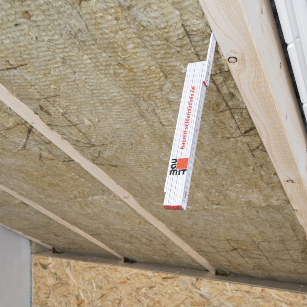 Ensuite, mesure la distance entre les chevrons environ 1 m plus haut (longueur du feutre de serrage utilisé). Cela permet de tenir compte des éventuelles différences de distance lors de la découpe de l'isolation entre chevrons.