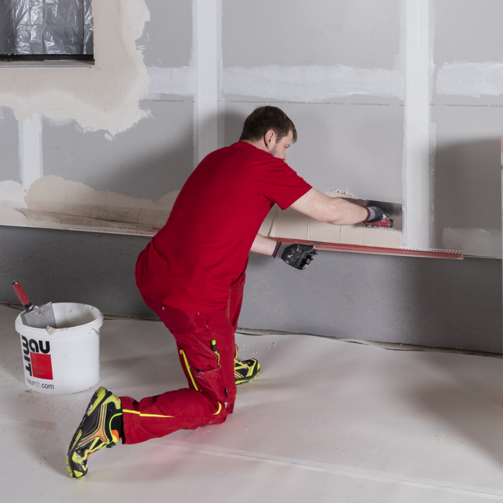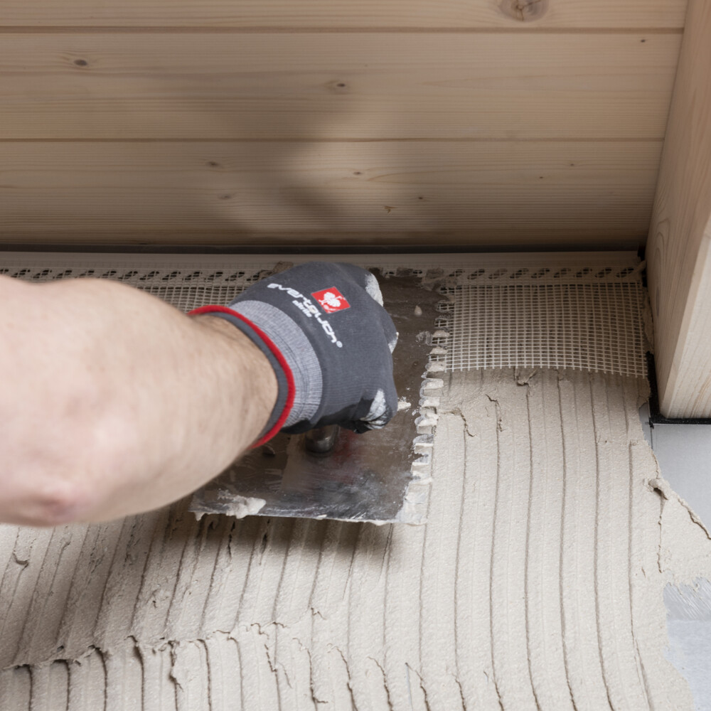 Avant d'appliquer la couche d'enduit d'armature sur toute la surface, le tissu du profilé emboîtable doit d'abord être encastré. Pour ce faire, applique l'Enduit pour façades et rénovation blanc fraîchement mélangé sous le tissu sur la plaque Fermacell Powerpanel H2Oà l'aide d'une truelle inoxydable.