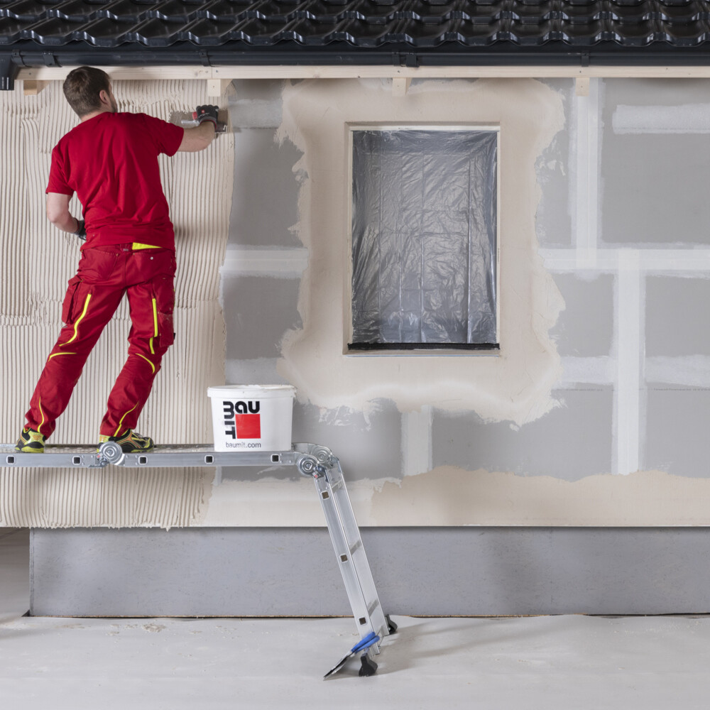 Juste après, tu poses la Toile d'armature Baumit dans la couche fraîche d'enduit d'armature.