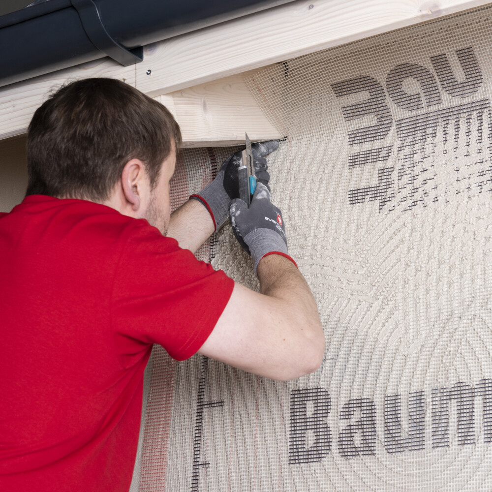 Même au niveau des fenêtres, des portes ou d'autres ouvertures, la Toile d'armature est découpée à 2-3 cm du bord. Veille à ne pas endommager, lors de ces travaux, le pan de tissu de l'angle de tissu sous-jacent.