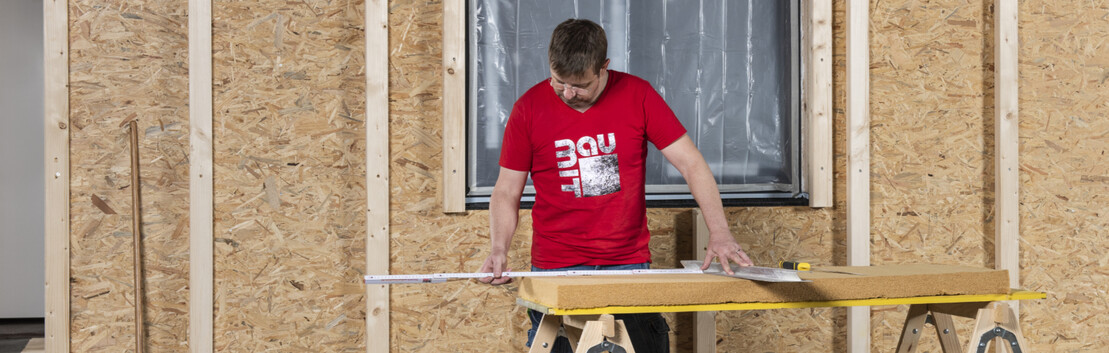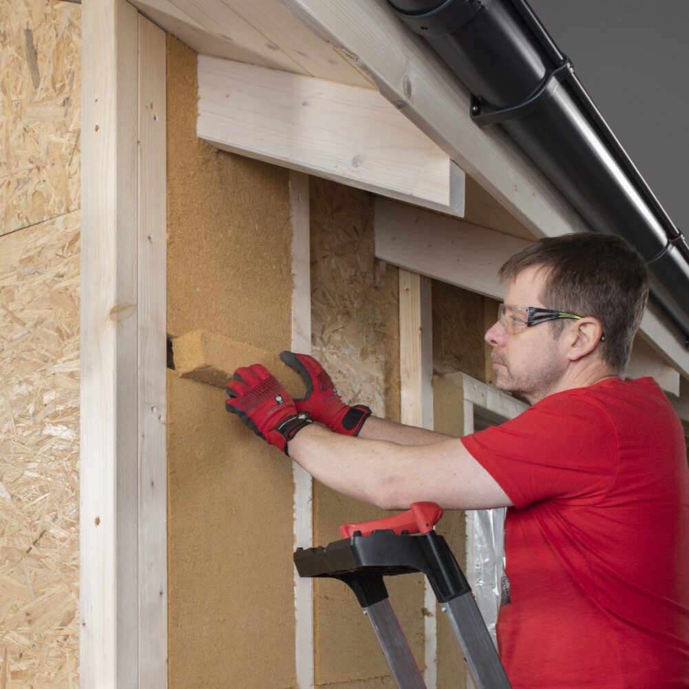 En cas d'utilisation de bois pour la structure porteuse de la façade isolante, nous recommandons d'utiliser du bois massif de construction (KVH). L'Épaisseur correspond à l'épaisseur prévue de l'isolant. La Largeur doit être d'au moins 60 mm. Dans le cas d'une double couche d'isolation, comme dans notre exemple, tu peux ajuster la distance entre les bois porteurs de la couche inférieure en fonction du matériau isolant utilisé, dans la mesure où les bois d'encadrement dans la construction du mur comme points de fixation le permettent. L'entraxe ne doit pas être supérieur à 62,5 cm. Il s'agit également de la dimension modulaire habituelle dans la construction à ossature bois, c'est-à-dire 62,5 cm pour l'entraxe des bois d'ossature verticaux.
