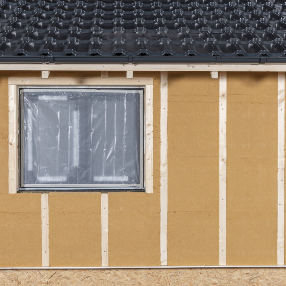 Les instructions de travail suivantes montrent la structure de base d'une sous-construction en bois (KVH) sur un support en bois pour une façade isolante suivante non ventilée avec des panneaux isolants en fibres de bois (panneau isolant en bois flexible). Sur un support en maçonnerie ou en béton, les étapes sont identiques, mais le type de fixations doit être adapté.