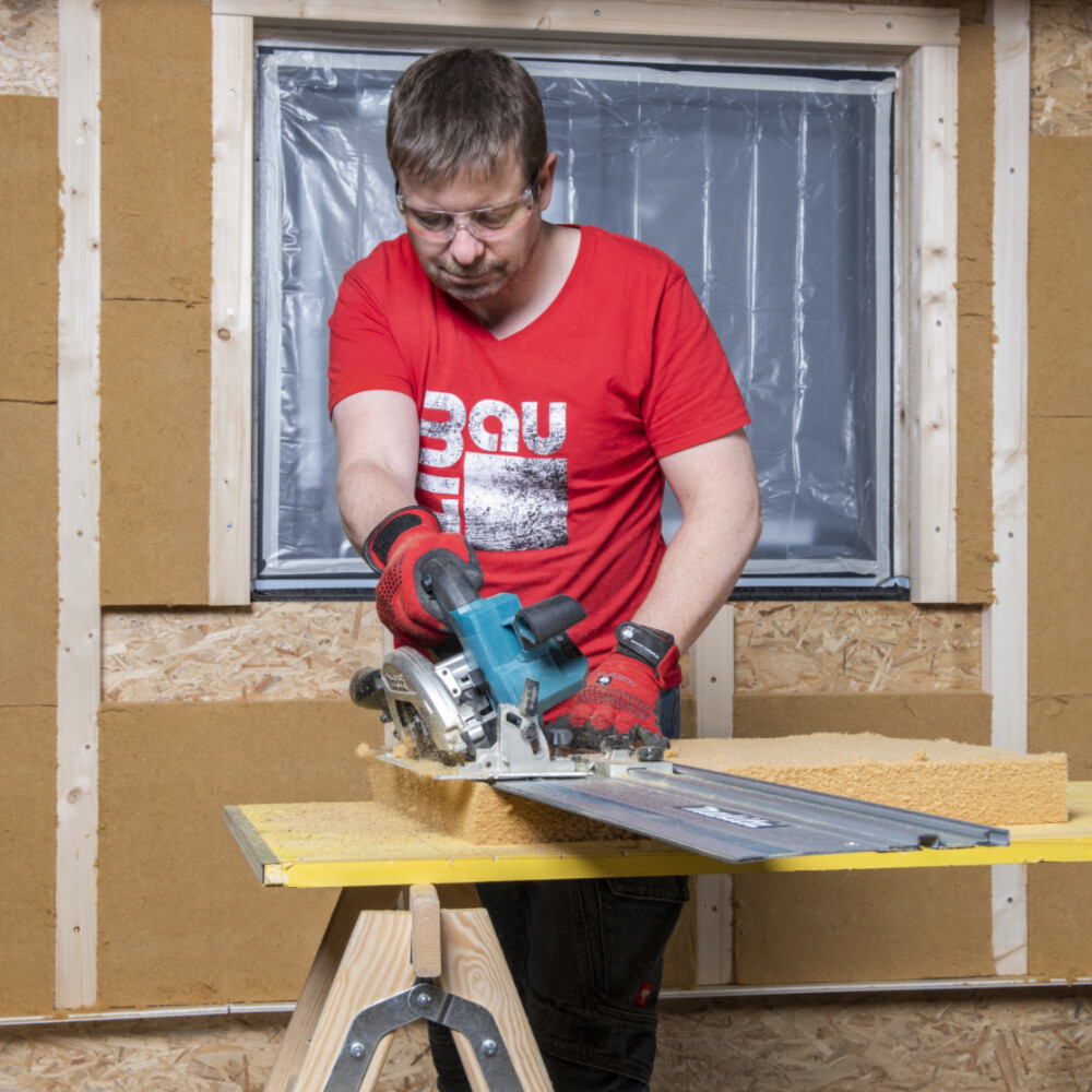 Si tu veux découper ce matelas isolant en fibres de bois avec une scie à main, place l'arête de coupe le plus près possible d'un bord dur. En raison de la structure des fibres, l'arête de coupe du Panneau isolant avec cet outil est légèrement effilochée.