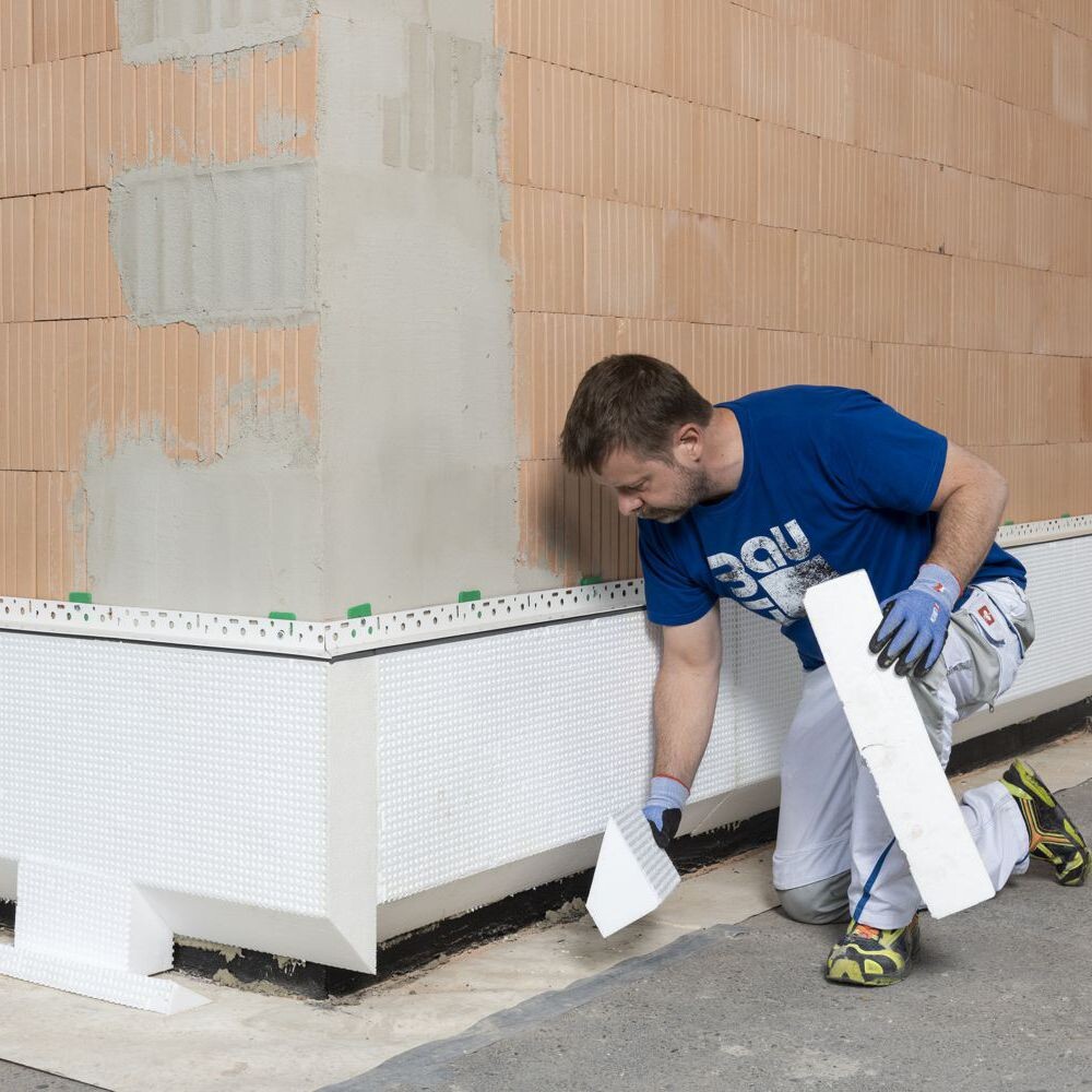 Pour que la protection contre l'humidité du socle fonctionne durablement, l'isolation du socle et du périmètre doit être découpée à un angle de 45° à son extrémité inférieure. De cette manière, le risque de fissures au niveau de la transition est réduit.