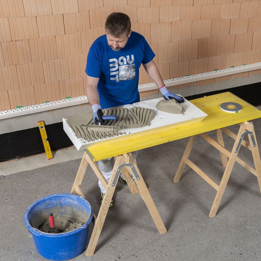 Mélange la Multisockel Base avec de l'eau claire dans un seau à mortier propre, sans faire de grumeaux. Applique la colle fraîche sur toute la surface du dos de l'isolation périphérique ou du panneau isolant de soubassement préparé.