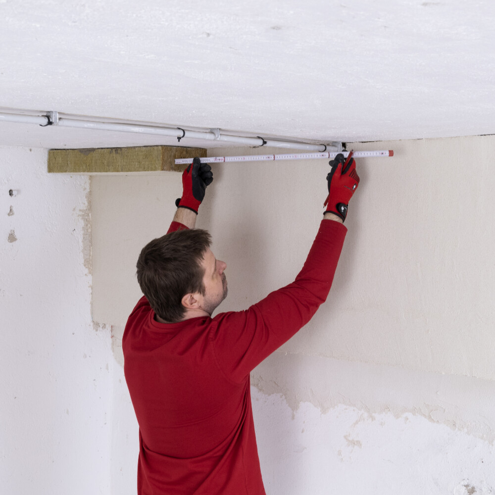 A l'aide d'une latte de réglage (150 cm à 180 cm de longueur), tu vérifies si le panneau isolant pour plafond de cave est collé dans le bon alignement.