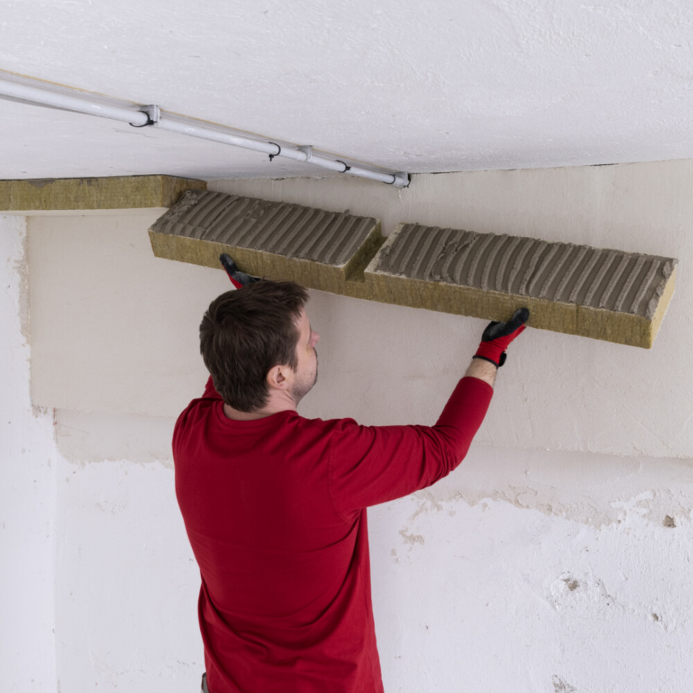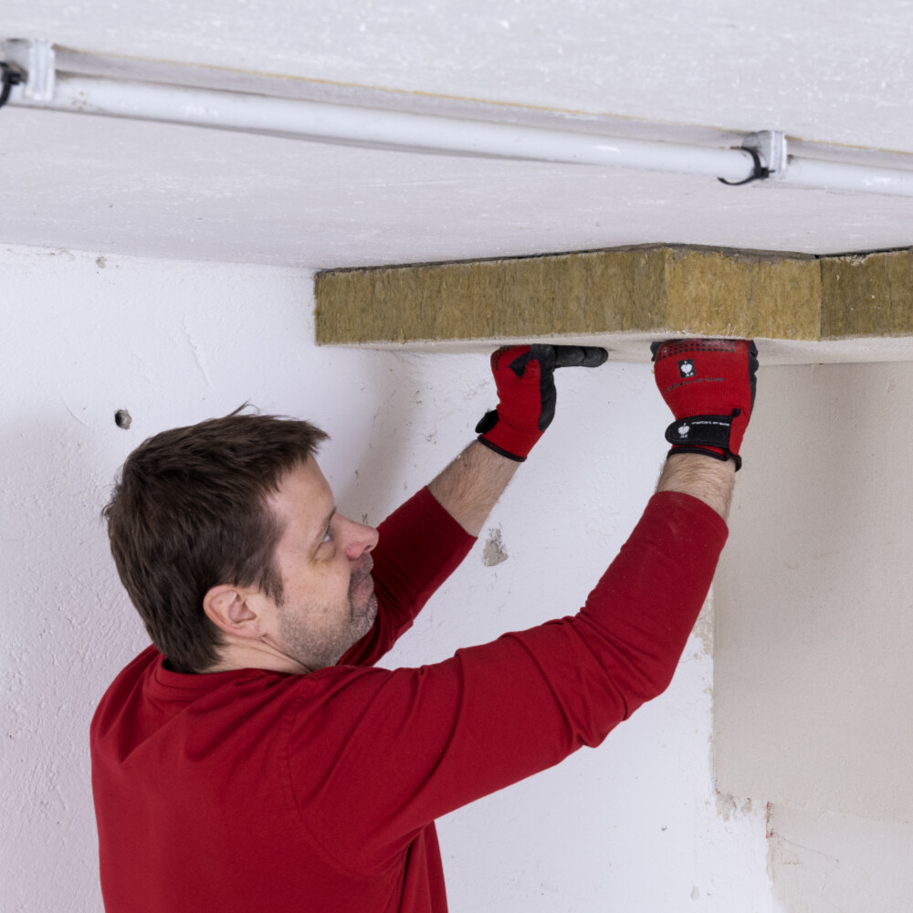 Les panneaux isolants pour plafonds de cave en laine minérale (lamelle) sont collés sur toute la surface d'un plafond. Comme le mortier adhésif ne permet pas de compenser plus de 5 mm d'inégalités, le plafond doit, si nécessaire, être égalisé au préalable avec le Mortier adhésif ALLROUND.